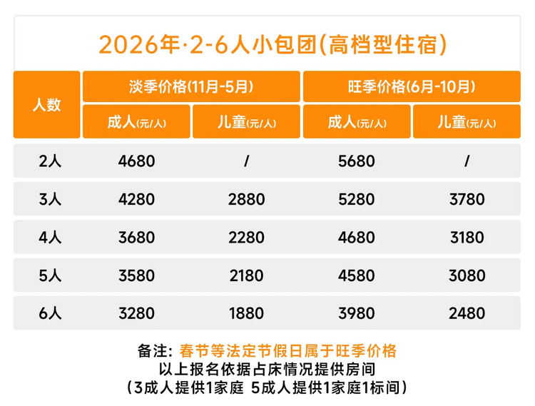 全程入住标间(一个房间两个床位)单个报名的,由领队安排同性拼房,如不愿拼房,需补交单房差,高档型住宿淡季单房差1100元/人,旺季单房差1300元/人;舒适型住宿淡季单房差800元/人,旺季单房差1000元/人;(不要求单独住宿,拼房不成的,单房差由俱乐部承担,请单个报名的伙伴放心报名。)儿童超过3岁的异性母、子,父、女不接受拼房,请补交单房差。