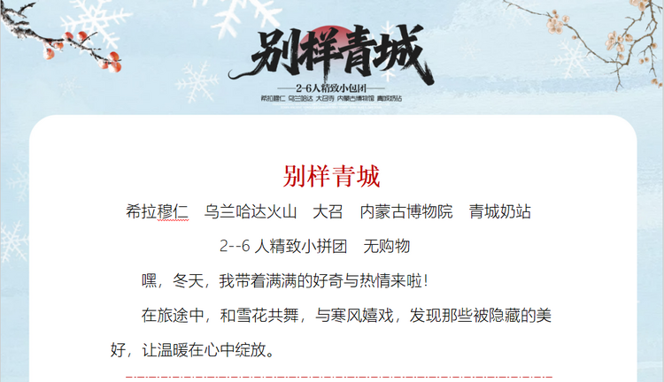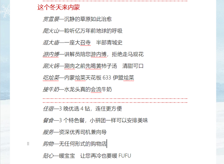 1、内蒙古的冬季寒冷干燥,需确保自己的身体健康状况适合参团旅游,旅游者签订本次旅游合同,即视为旅游者对此次旅游的辛苦程度和医疗条件了解;因个人既有病史、身体残障或突发疾病在行程中发作或伤亡,旅行社不承担任何责任;旅行社投保的责任保险和旅游意外伤害保险条款中对此类情况也属于免责免赔范围;