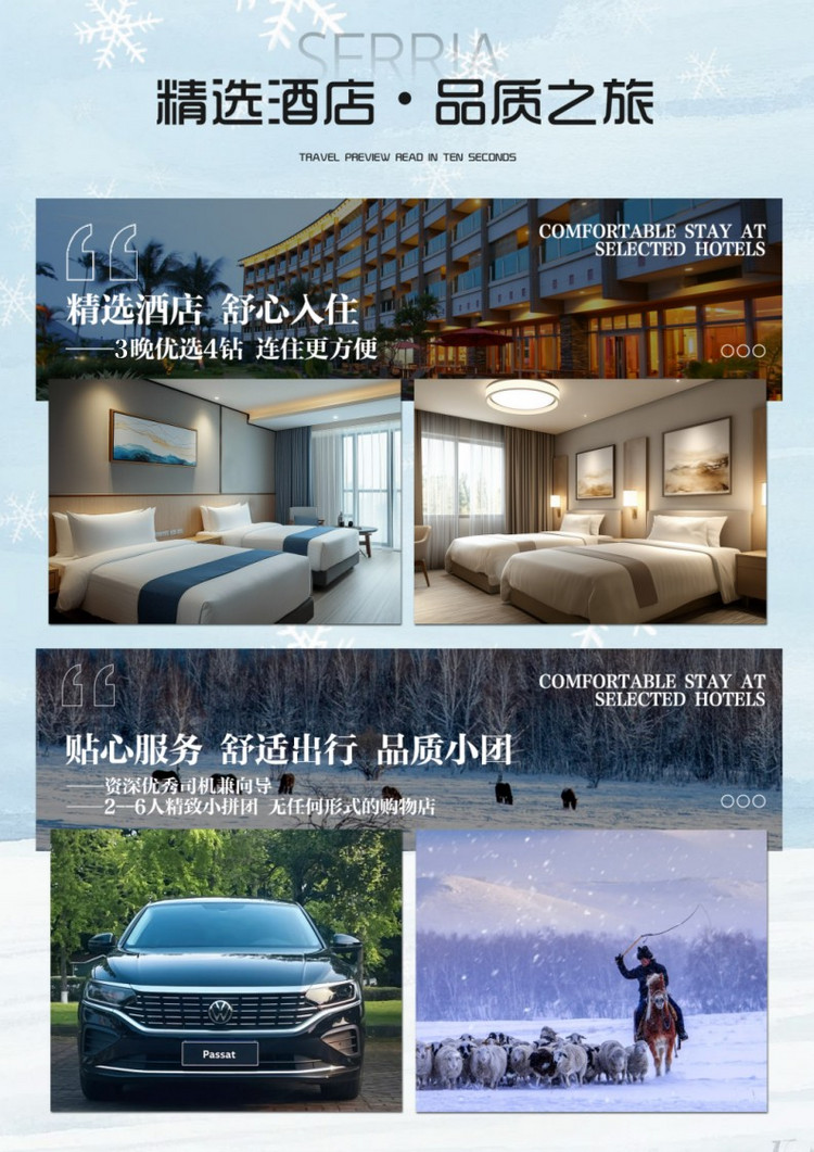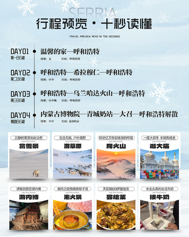 1、交通:呼和浩特出发及呼和浩特解散的全程专属用车及司机星级服务(含司机餐补、住宿)