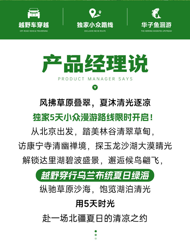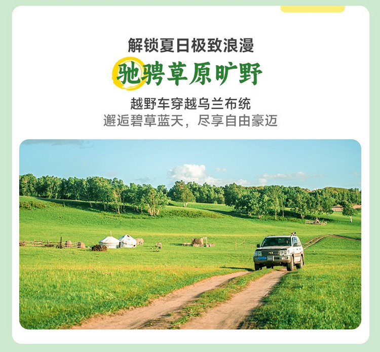 早餐后,出发前往多伦,适时换乘硬派越野才开启今日的重头戏 --【全天越野车穿越】。我们轻装简行,仅携带随身物品和饮用水即可。向草原深处出发,今天将开启神秘精彩的草原无人区穿越之旅。今天的路线以越野体验为主,部分路段比较原生态,乘车时务必注意安全。深入无人之地,探秘原始草原,发掘小众秘境。穿行在天地之间,享受追逐羊群的时光,邂逅森林驯鹿,行走在最美边界线,以最真实的方式与马、牛、羊交流。有些地方,只有越野才能抵达,而沿途的风景,也是常规路线无法体会的梦幻与壮美。越野车穿越,玩遍原始草原,沙漠,森林,湿地四大地貌,欣赏了草原美景,感受了越野车穿越草原的刺激,收获满满。