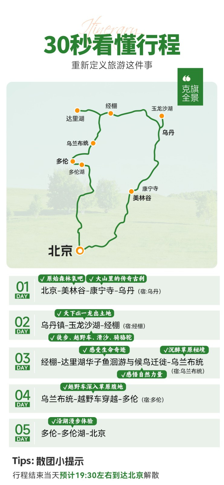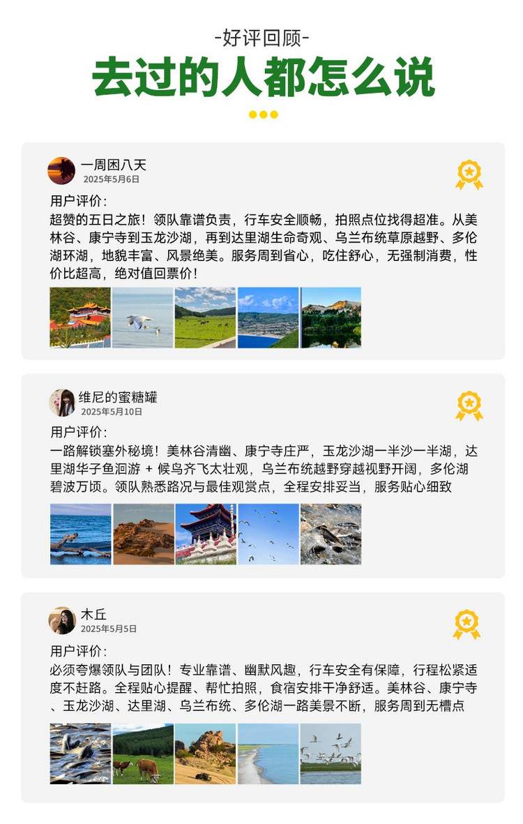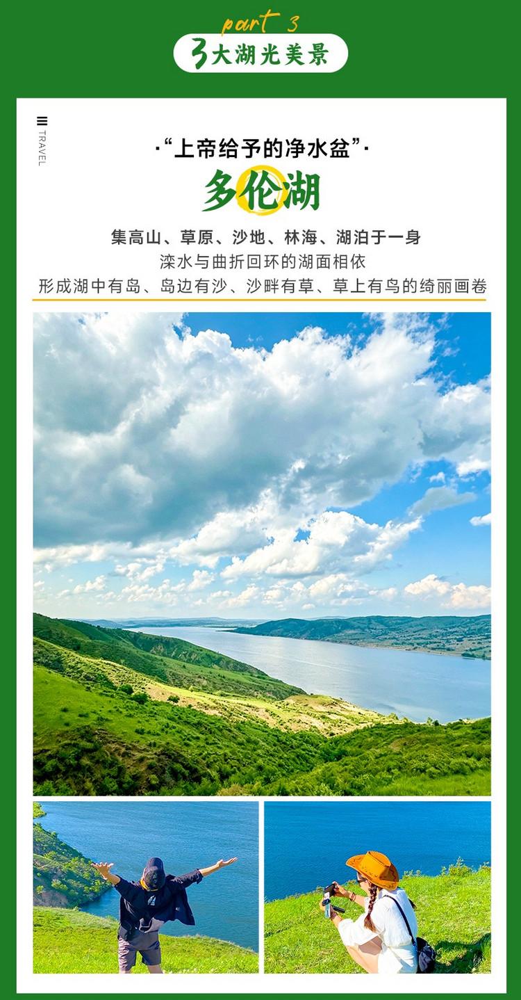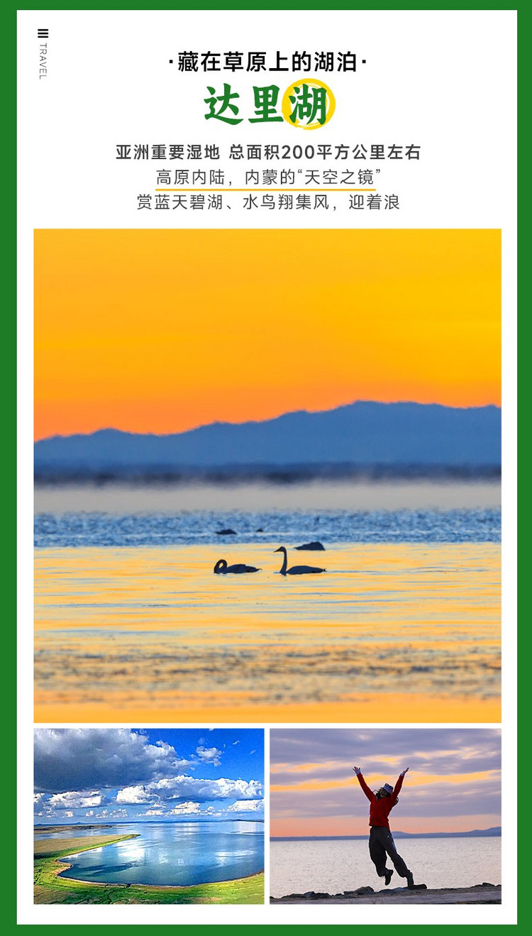 5、门票:玉龙沙湖首道大门票;达里湖南岸首道大门票+景交车;多伦湖首道大门票;
