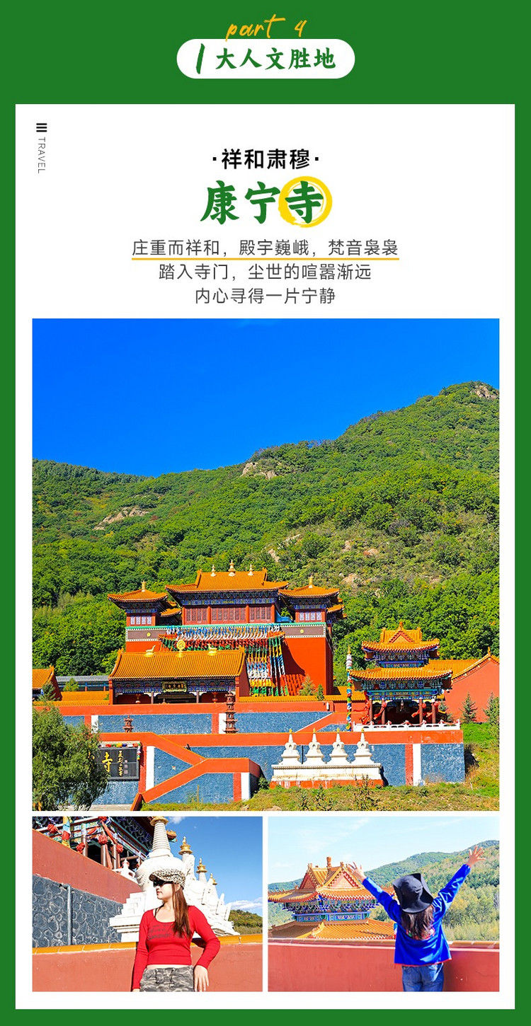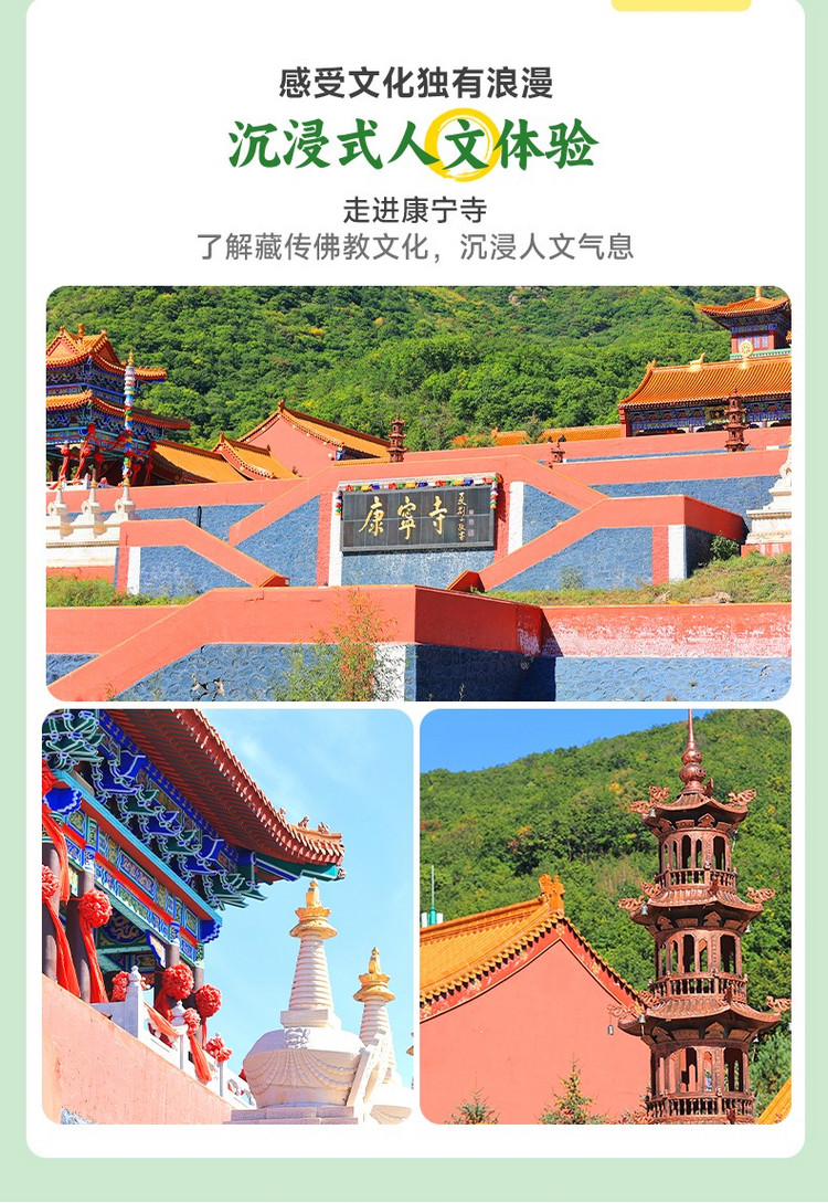 ·【康宁寺】山环水抱的藏传佛教康宁寺,透出浓浓的人文气息,祥和、宁静,是离北京最近的“世外桃源、香格里拉”。占地 100 余亩,总建筑面积 5000㎡,建筑遵循原 “哈日和屯寺” 之精髓,融合蒙、满、汉、藏多种文化风格,依山傍水,应乾坤之象,依照自然环抱式山貌和阴阳生两仪的自然三才地势而建。