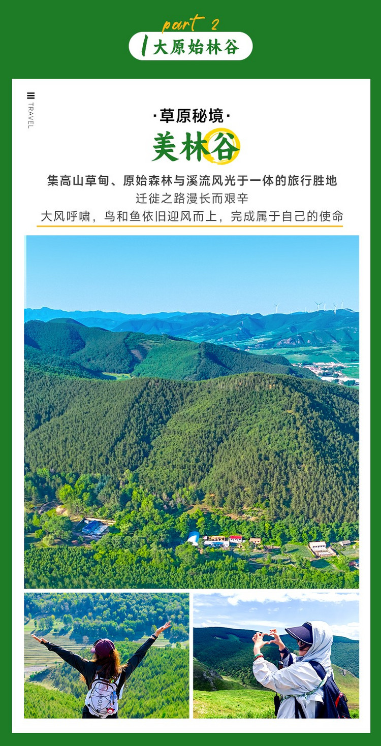 ·【美林谷】位于内蒙古赤峰市喀喇沁旗境内,环抱于茅荆坝国家级森林公园之间,美林谷地处林区,气候凉爽,雨量充沛,景色宜人,历史上就是清朝皇家林苑“木兰围场”的一部分。