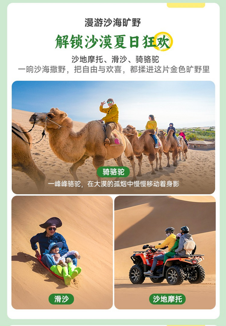 温馨提示:沙漠景区内有丰富的餐饮供应,景区内正餐价格较高,可以根据需求自带午餐;