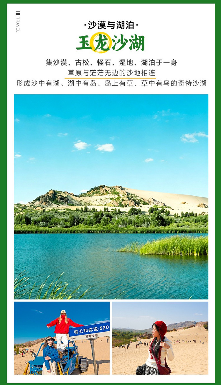 ·【玉龙沙湖】拥有中国独特的“白沙漠、红砂岩”,占地 100 平方公里,以大漠为主色调,集响沙、草原、湖泊、湿地、怪石、奇松等元素为一体,5 万亩草原与科尔沁沙地相连,沙地中有清泉积水成湖。