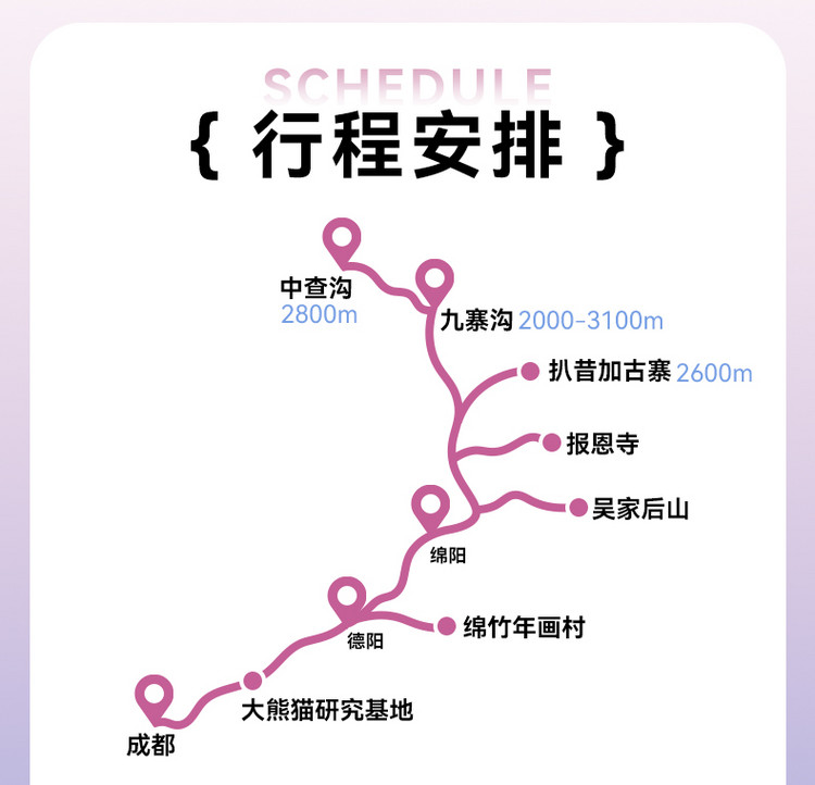 ▷ 海拔变化:九寨沟沟口2000米→景区海拔最高点3100米→中查沟2800米→成都500米
