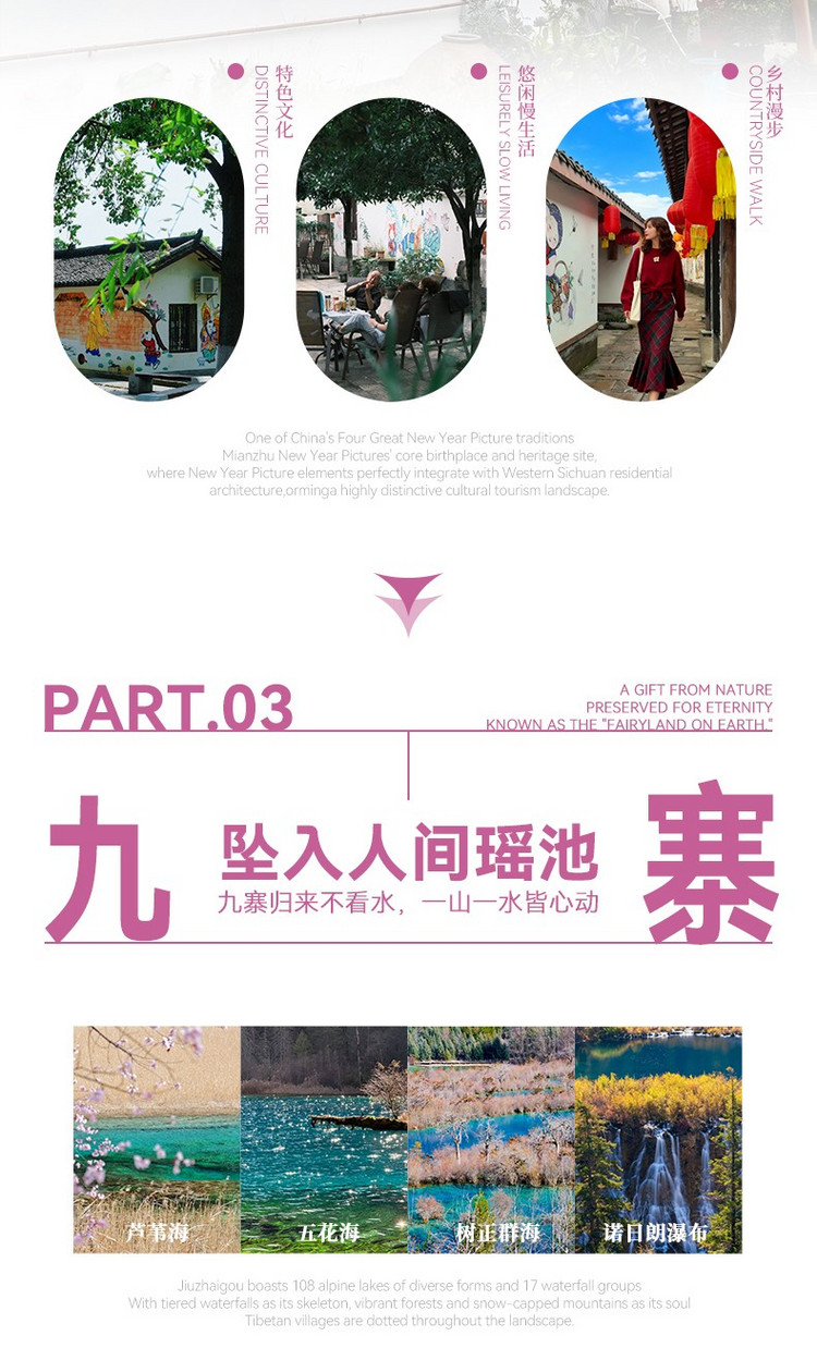 景区游览:参考“Y”字形动线。乘观光车至日则沟顶端,自上而下游览箭竹海、熊猫海、五花海(核心景点,建议停留1.5小时)、珍珠滩瀑布。