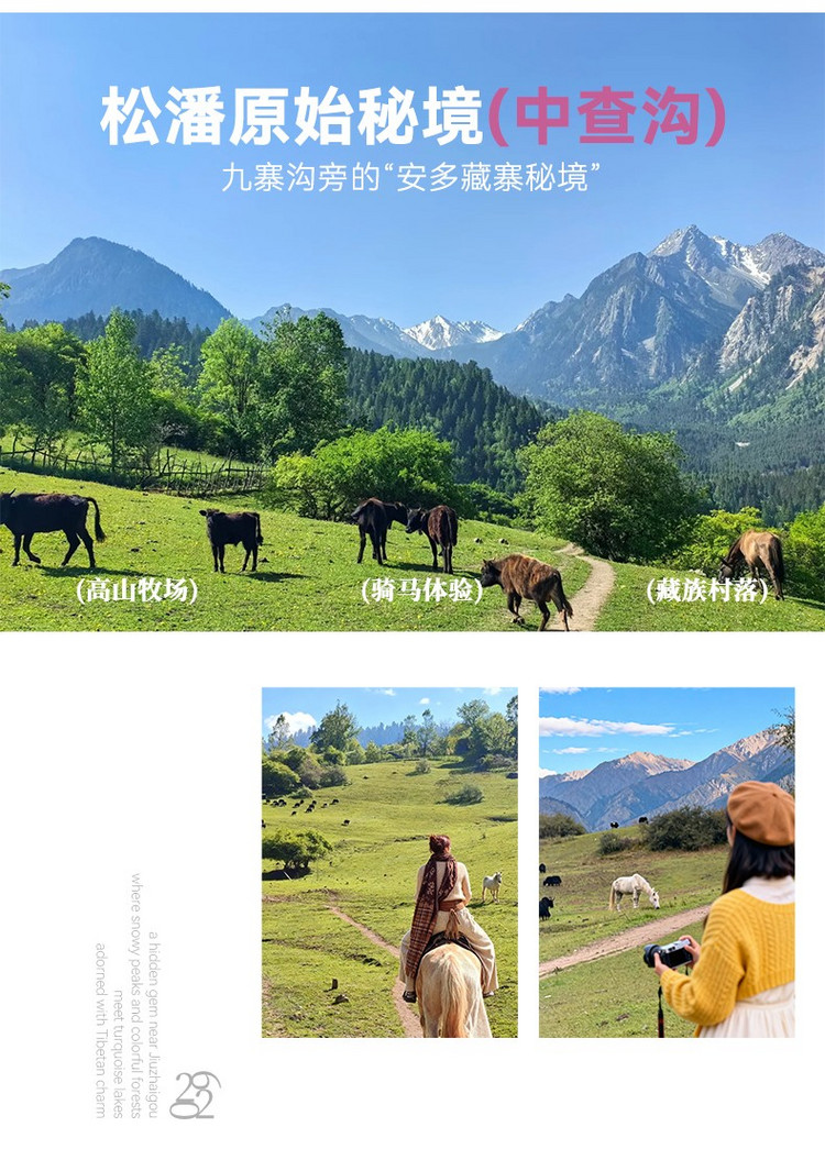 上午 (09:00-12:30):早餐后前往中查沟(约15km,0.5h)。可体验骑马或选择森林徒步(约5小时),深度感受藏族村落与自然风光。