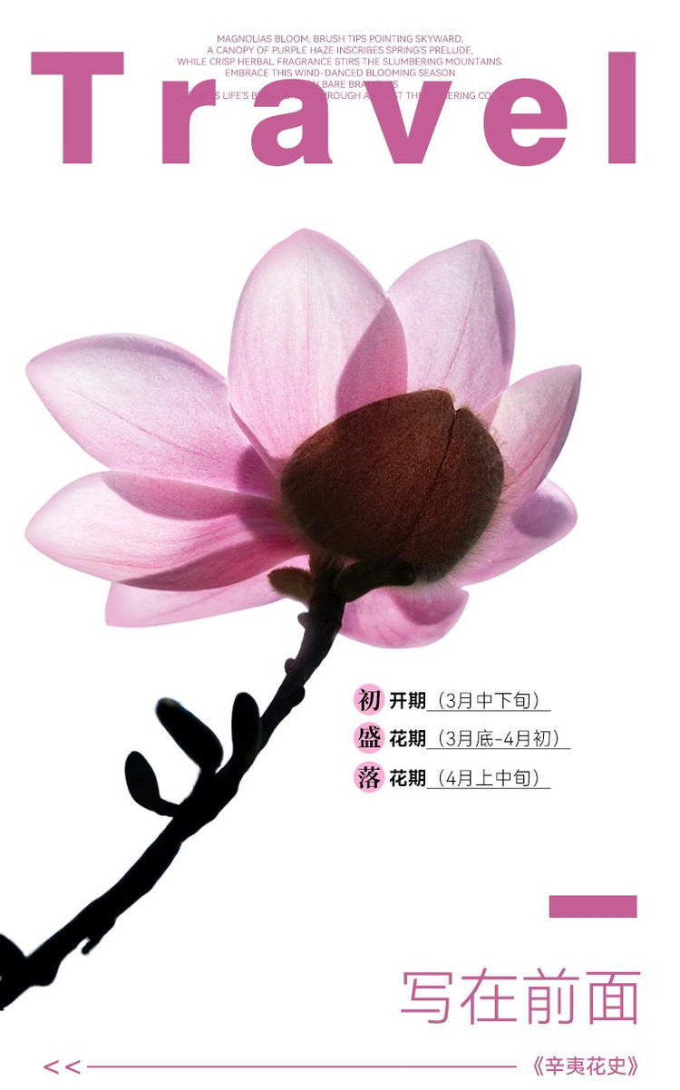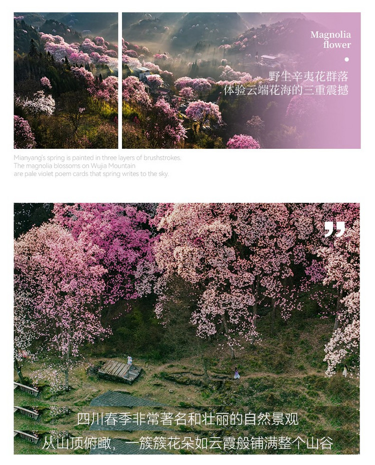 下午 & 晚上 (14:30-19:30):前往江油吴家后山(约120km,3h)。抵达后入住民宿并用晚餐。辛夷花最佳观赏期为每年3月底至4月初。