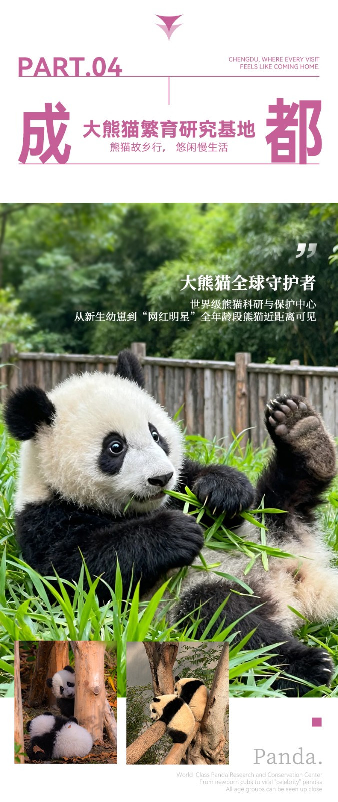 上午 (07:30-12:30):从成都出发,前往成都大熊猫繁育研究基地(约50km,1.5h)。建议游玩3小时,在07:30开园时尽早入园,以避开人流并看到更活跃的大熊猫。