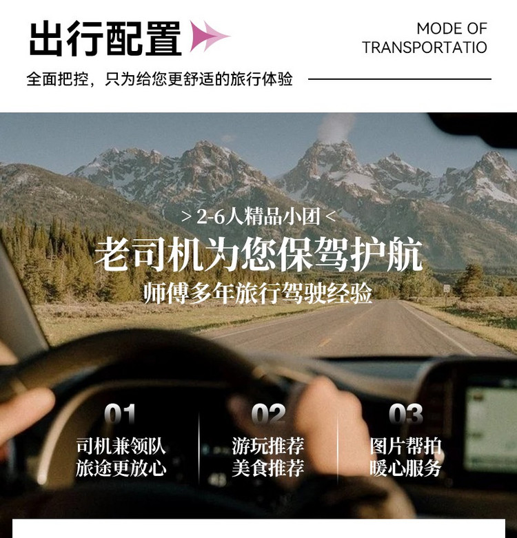 1. 交通:全程包车往返,根据人数安排合适车型。