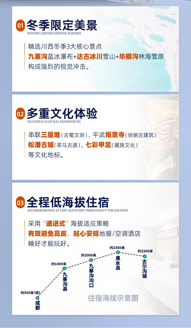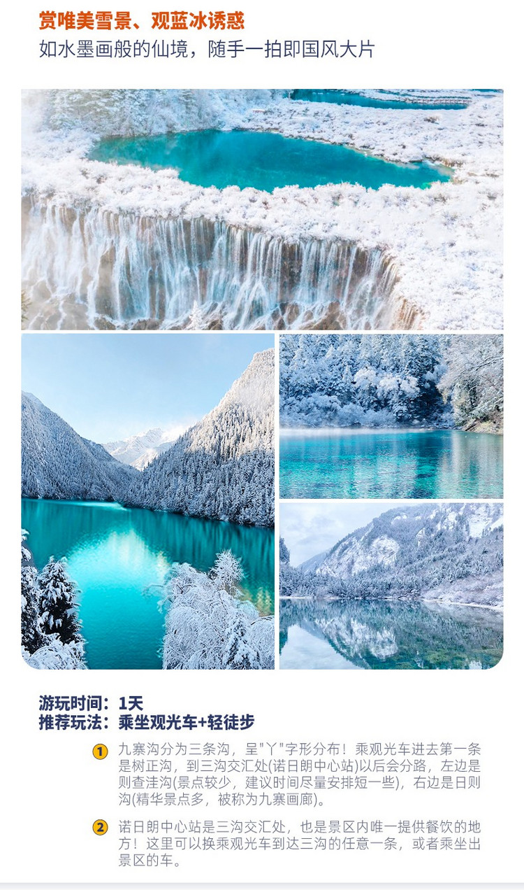 特色介绍:九寨沟冰雪童话、灵韵冬色、蓝冰诱惑