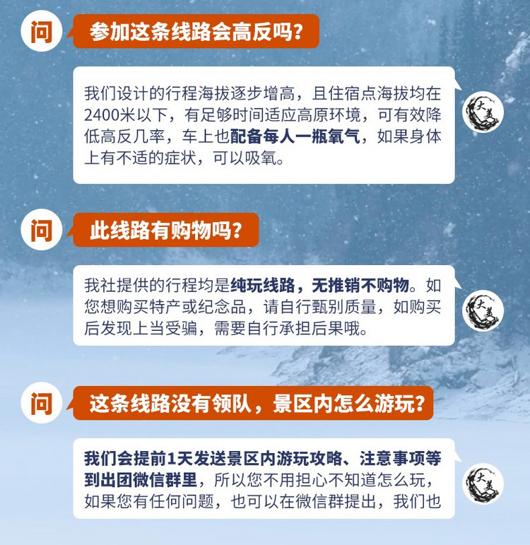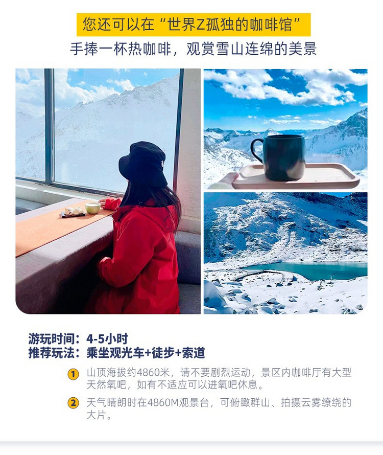 (1)达古冰川景区山顶海拔达到4860米,可乘坐索道抵达,您可根据自身身体状况选择前往,进景区后请不要剧烈运动,景区内有大型天然氧吧,如有不适应可以进氧吧休息;