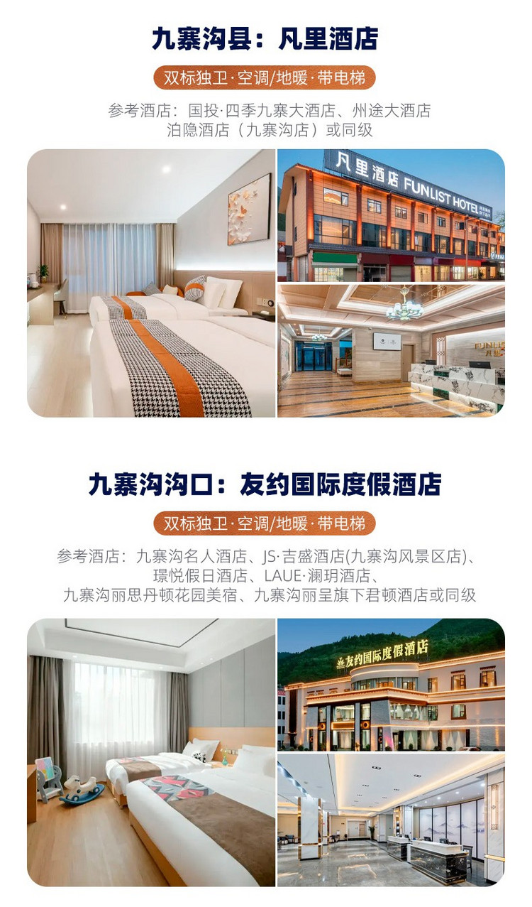 (2)到集合酒店报“大美九寨+姓名”拿房,房费已付,押金自付。入住酒店的时间一般在集合日当天的14点以后,如果您提前到达且酒店房间未整理出来无法办理入住,可将行李暂时寄存在前台,先在市区周边自由游玩;