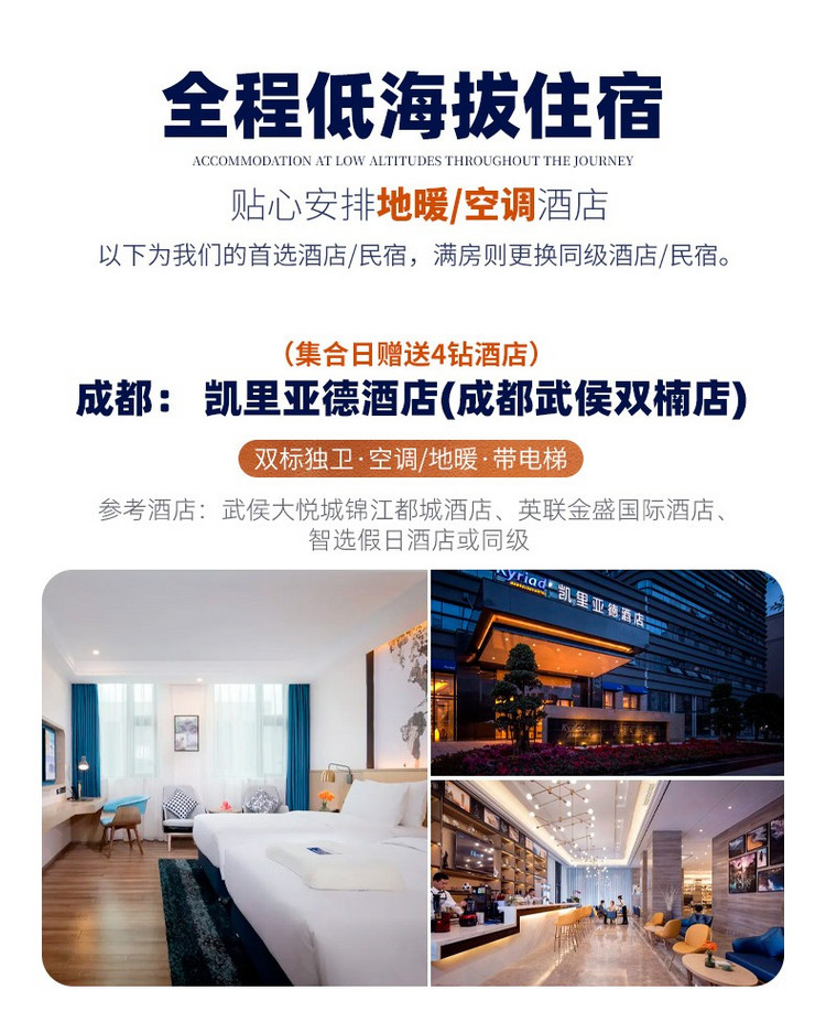 2、住宿:全程5晚地暖/空调标间住宿(含集合日赠送1晚4钻酒店、不住不退);