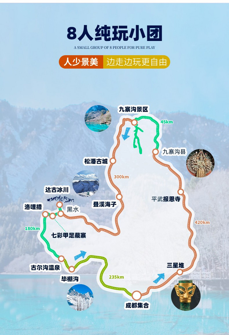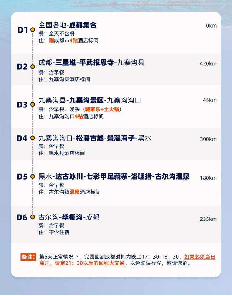(1)以上行程时间安排可能会因天气、路况等原因做相应调整,正常情况下完团回到成都时间为晚上17:30至18:30左右,如果必须当日离开,请定21:30以后的回程大交通,以免耽误行程,敬请谅解;