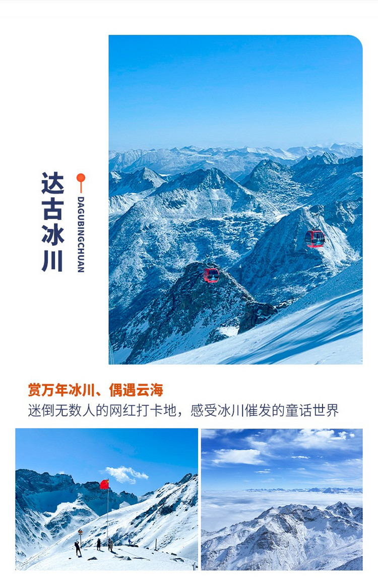 【行程概述】早餐后乘车前往【达古冰川】,达古冰川是全球海拔最低、面积最大、年纪最轻的冰川,我们从景区门口坐观光车(景区观光车70元/人,费用自理,必须乘坐)到索道口的路上会遇见大大小小的湖,远处的雪山在阳光下,显得更加雄伟壮观、如梦如幻。很快我们就能到达金丝猴经常出没的【金猴湖】,如果足够幸运,在这里能看到金丝猴,随后游览【红军湖】、【红军桥】、【神牛湖】,欣赏沿途的美景。后到达索道下站,也就是观光车终点站,从这里开始就是达古冰川的精华景点。我们可以在索道下站坐索道直接上到山顶的冰川腹地,看连绵雪山冰川,观赏【一号冰川】,感受一览众山小,俯视一切的雄壮气概。还可以在世界上海拔最高的咖啡馆,同时也被称为【世界上最孤独的咖啡馆】,喝上一杯咖啡,饱览美景。回到索道下站后,还可以徒步游览【凌云瀑布】。游览后出景区继续行车,就会看见一个比彩虹还绚丽的高山藏寨--【七彩甲足】,缤纷的色彩、大胆的用色、传统的藏式民居,让所有到来的人都眼前一亮。游览拍摄之后车继续前行,沿途会经过一个叫【洛哩措】的地方,这里像是一块地球送给我们的绿宝石,阳光和煦、波光粼粼,连掠过的风,都是自由的。一路边走边玩,晚上入住古尔沟镇,可以泡泡温泉,放松放松。