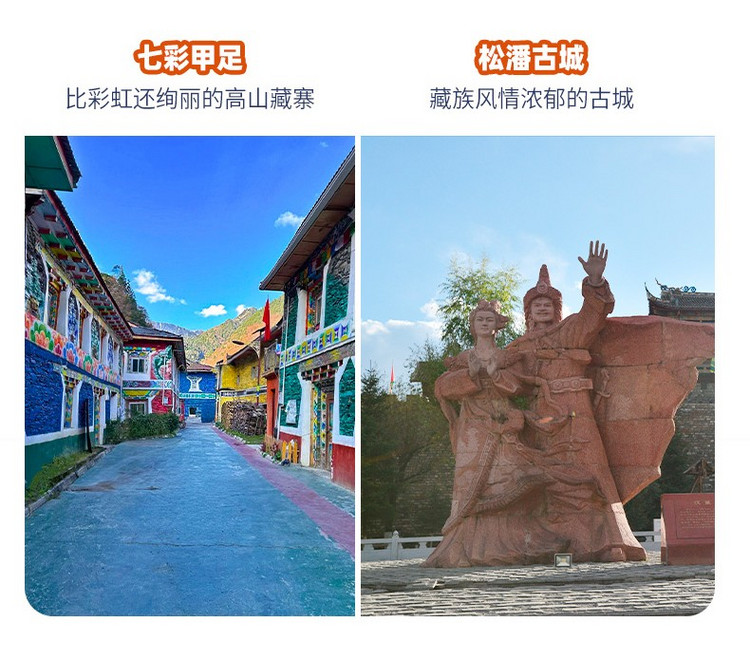 【行程概述】早餐后从九寨沟出发,沿途欣赏美丽的高原风光,随后到达【松潘古城】游览,这里曾经是川、甘、青三省边区最大的贸易集散地,是一座真正“活着”的千年古城,处处都散发着历史的气息与魅力,这里的美食众多、烟火气十足,牦牛酸奶、青稞饼、牦牛肉串、牦牛肉汤锅、甘肃面块等都非常美味,且物价亲民。有兴趣的小伙伴可以步行约10多分钟前往半山腰的观音堂,俯瞰松潘古城全貌,拍人文大片。游玩后继续行车,而后来到【叠溪海子】,这儿碧波荡漾、风景秀美,被称为“中国最美的地震遗址”。