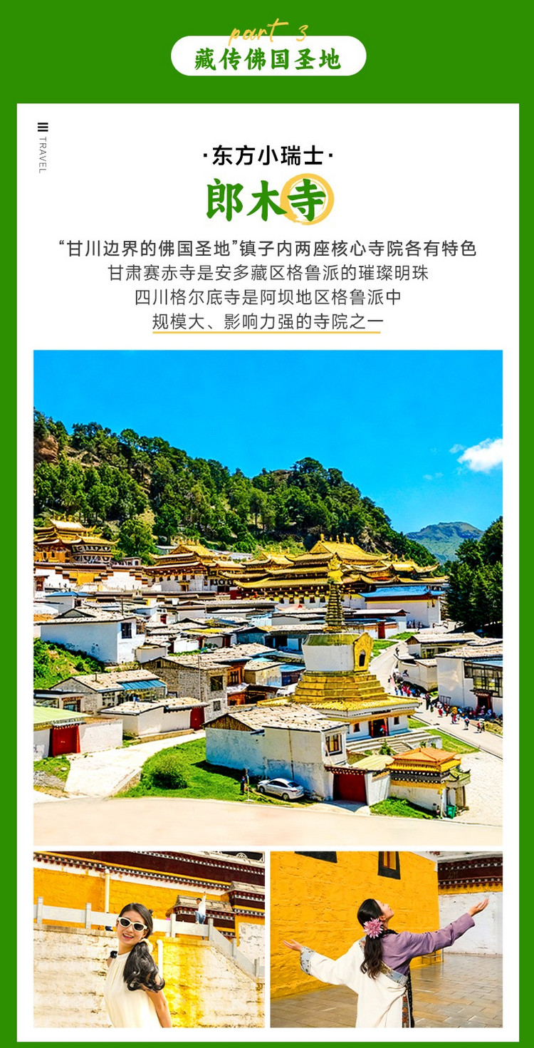 用完早餐后,我们将乘车前往【郎木寺】(120km,车程2小时,游玩2小时),郎木寺不是寺,是镇名。郎木寺镇被白龙江源头小溪划分为两部分,四川的“安多达仓郎木格尔底寺”和甘肃的“赛赤寺”在这里隔江相望。先前往四川的【格尔底寺】,其内供奉着百年不腐的活佛肉身,有佛缘即可参观。随后你前往甘肃的【赛赤寺】,属于藏传佛教格鲁派寺院,寺内供奉着从印、尼、汉、蒙、藏等地迎请的用金、银、铜铸造和珊瑚、珍珠、松耳石等各种珍宝塑制镶嵌的大小佛像共四千余尊。