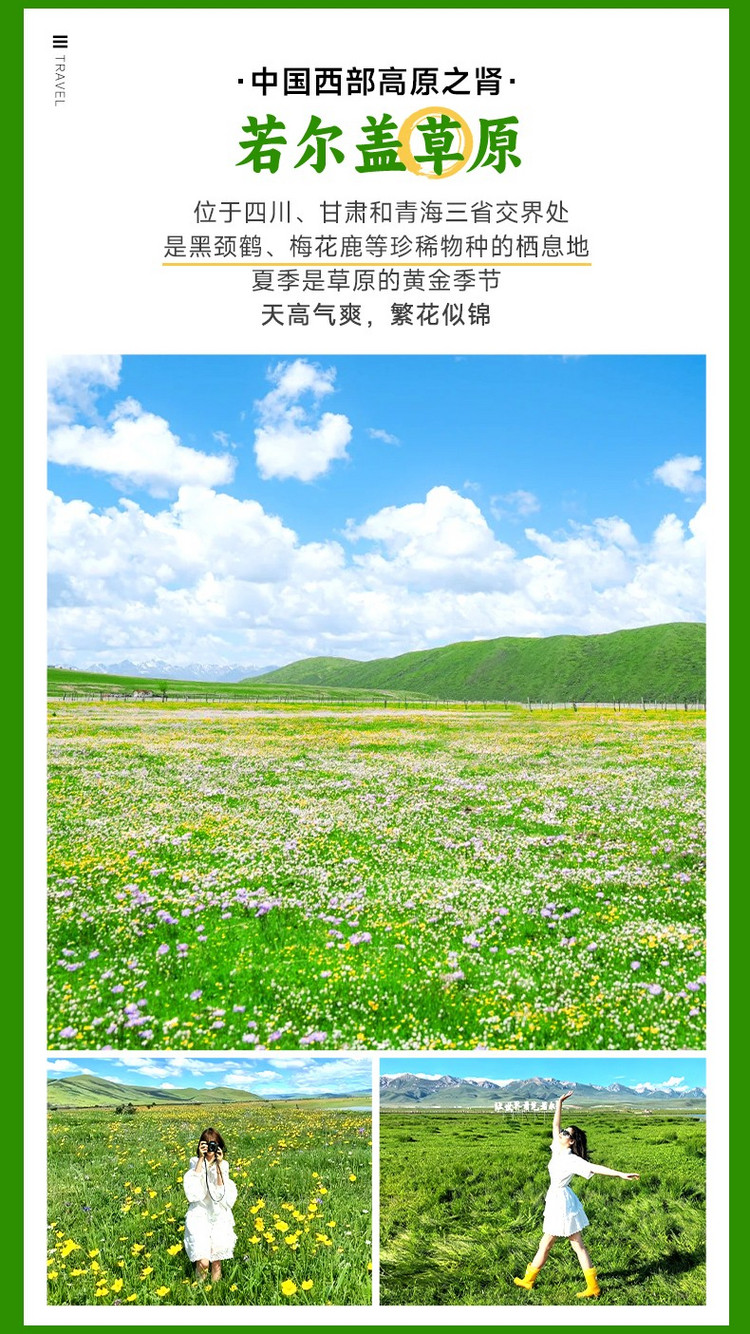 随后前往【若尔盖草原】(100km,车程2小时,游玩3-4小时),花湖位于四川若尔盖和甘肃郎木寺之间的213国道旁,是热尔大坝草原上的一个天然海子。花湖经典的时间是在五六月份,湖畔五彩缤纷,好像云霞委地,而湖中则开满了水妖一样的绚丽花朵,这种植物看起来平淡无奇,在雨水充沛的八月把纯蓝的湖水染成淡淡的藕色,时深时浅,像少女思春时低头的一抹酡红。
