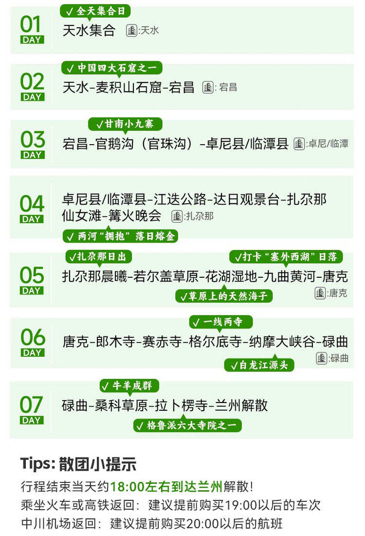 2、行程结束当天18:00左右抵达兰州西,大家可以依据自己的时间,自行选择继续游玩或是启程回家。乘坐火车和高铁建议购买19:00以后的车次,飞机建议购买20:00以后的航班。