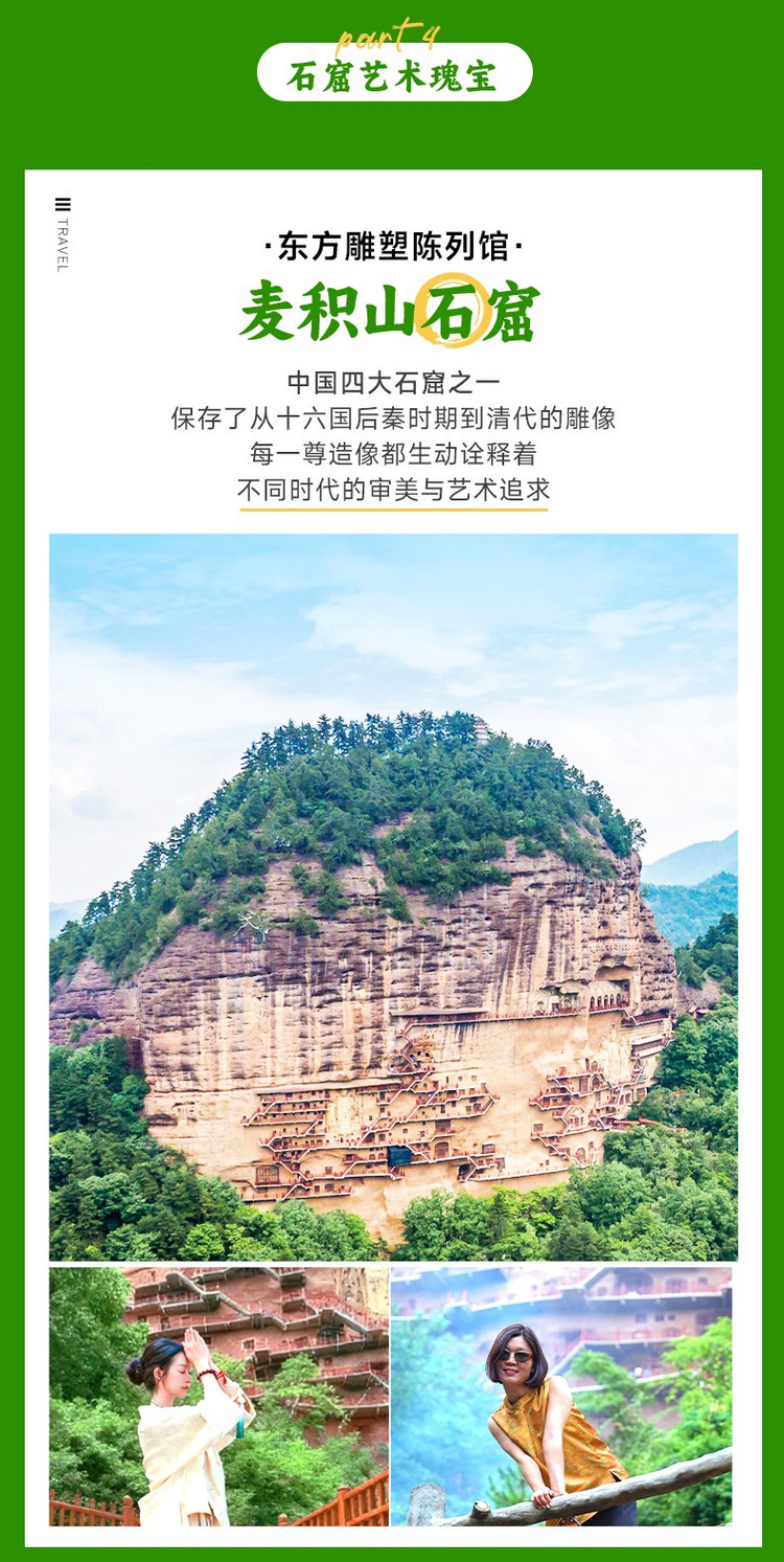 早餐后离开天水,开启这场期待已久的心灵之旅,一路高速来到【麦积山石窟】(车程约45公里,用时约1小时,游玩时间约3-4小时)。麦积山风光秀丽,素有“秦地林泉之冠”的美誉。麦积山石窟位于岩壁陡峭、绿植环抱的麦积山,是中国四大石窟之一。