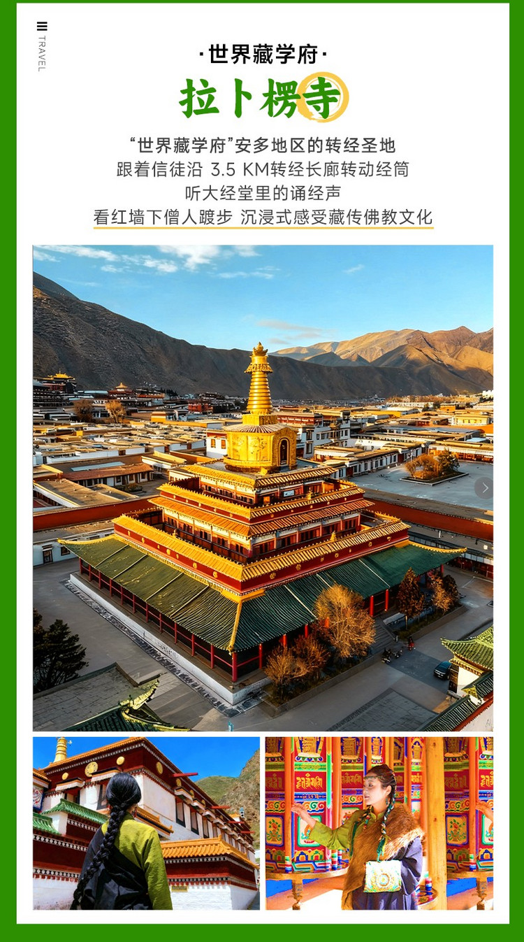 寺院规模宏大,这里有恢宏的寺院建筑群,供奉着无数的巨大佛像和各种精美的雕塑、壁画、法器等。拉卜楞寺超长的转经长廊是全世界罕见的,共2000余个转经筒,转遍每个转经筒至少需一个小时。一般游览拉卜楞寺的方式都是顺时针绕寺一圈,这也是藏传佛教的朝圣仪式。在拉卜楞寺西南角有座古老的木桥,横跨夏河,过桥上山,站在晒佛台上能将拉卜楞寺的全景尽收眼底。带给他的信徒以平安与圆满。感兴趣的小伙伴可以沿着转经长廊推转经筒,感受藏民文化。