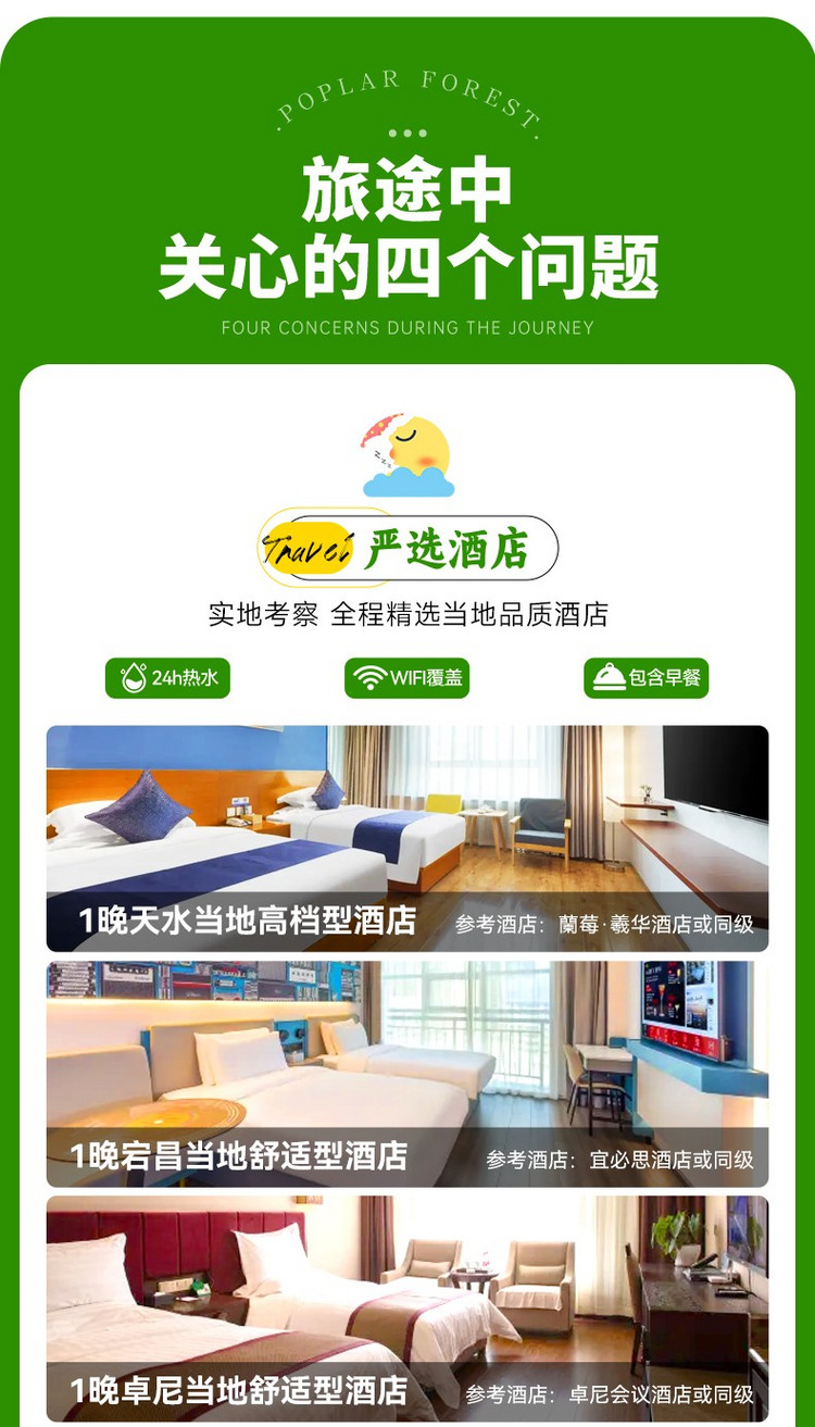 1、交通:天水出发及兰州解散的全程专属用车及司机星级服务(含司机餐补、住宿)