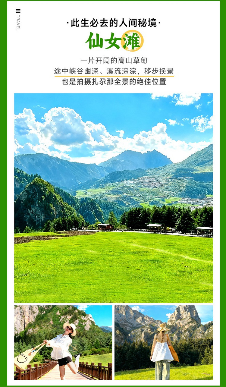 在群山环绕之中,有一处大片的草坪,平整的木栈道,那就是【仙女滩】(6km,车程约0.5小时,游玩1小时),在这里可以一览无余的饱览整个扎尕那山峰的全景。这里也是《中国国家地理》笔下 “此生必去的人间秘境”无论是沿着木栈道漫步,还是骑马穿行其间,都能感受到大自然的宁静与壮美。