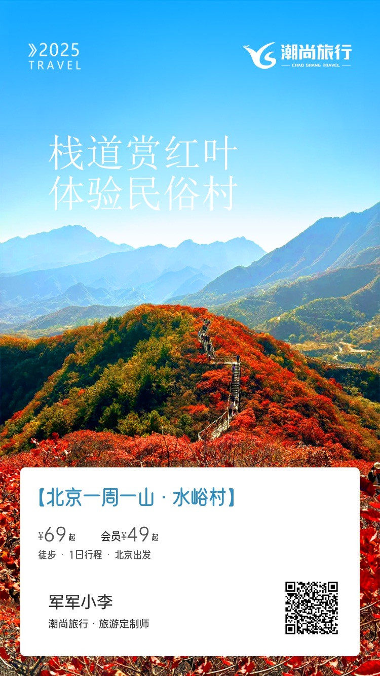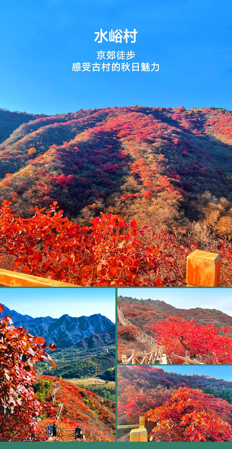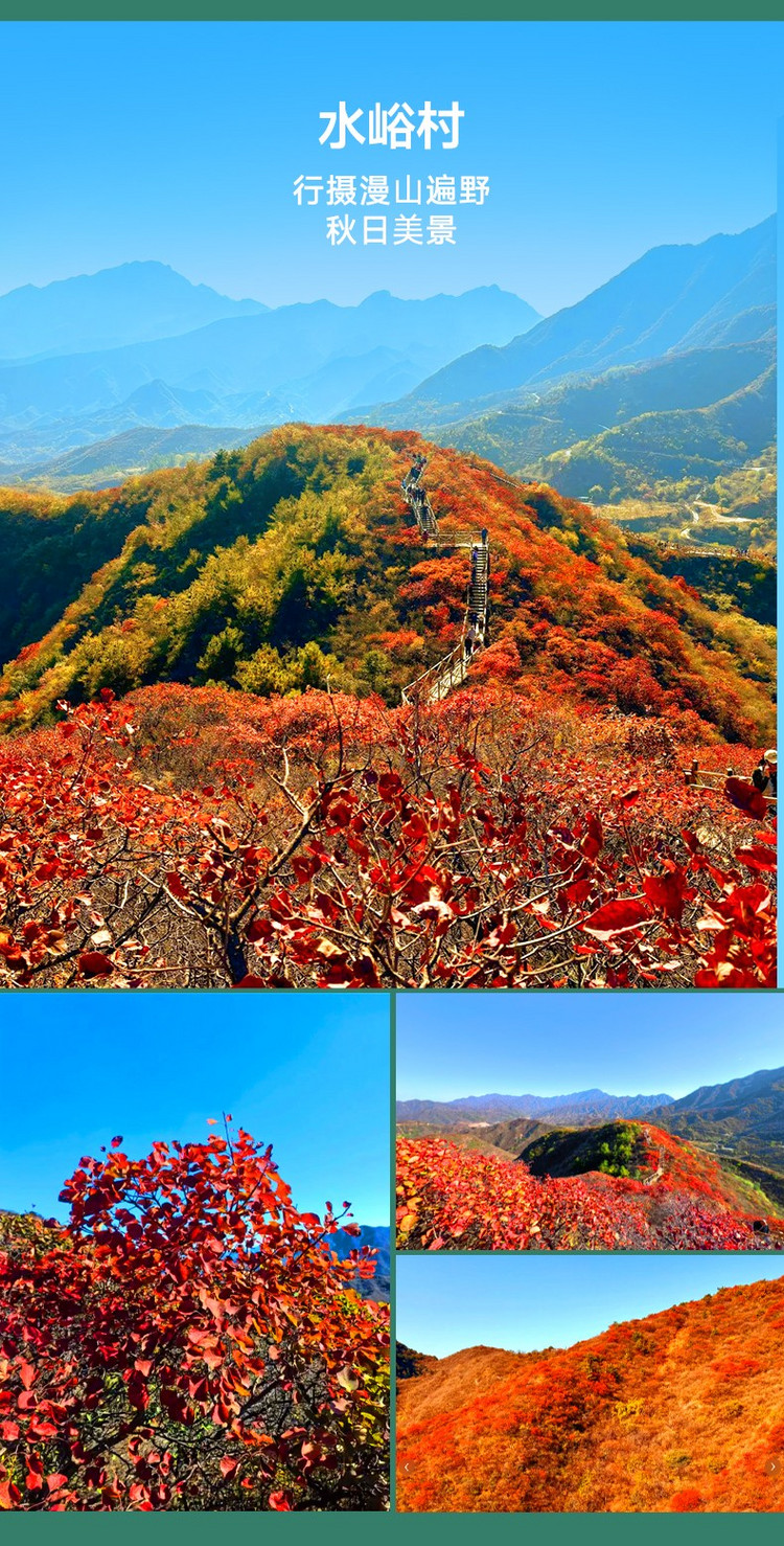 10:00左右到达徒步起点南窖乡水峪村,短暂的热身和准备后,我们沿着山路向上,你将欣赏到秋季的红叶遍布,仿佛群山被红色颜料渲染。