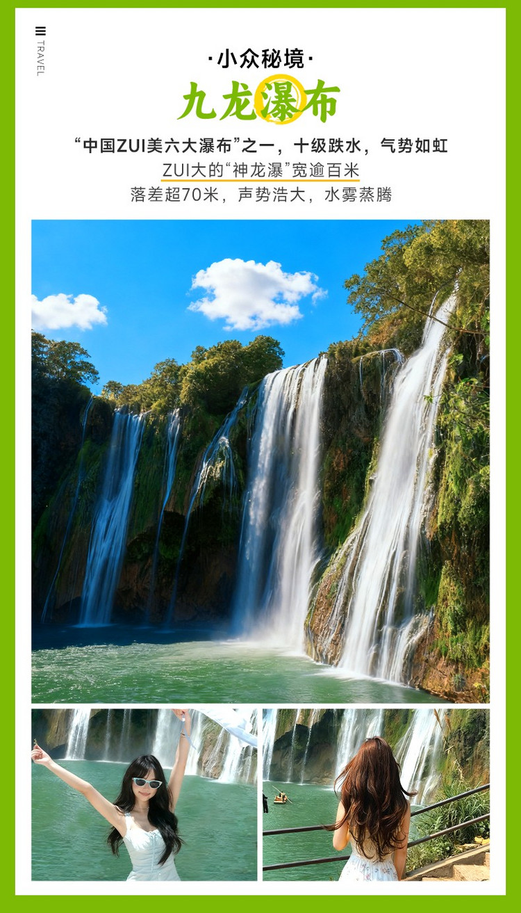 09:00 抵达【九龙瀑布群】。由于特殊的地质构造和水流的千年侵蚀,在此形成了十级高低宽窄不等,形态各异的瀑布群,其中最大的一级宽112米,高56米,气势恢宏,号称九龙第一瀑。九龙瀑布群因其瀑布众多,素有"九龙十瀑,南国一绝"的美誉。