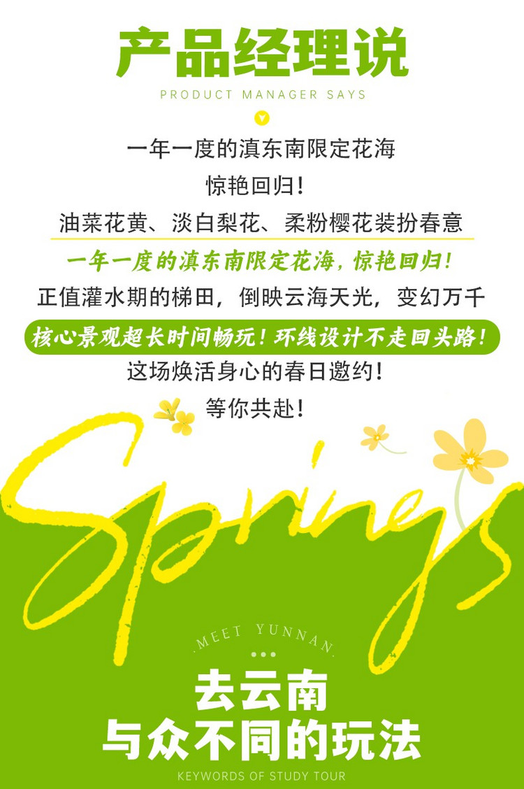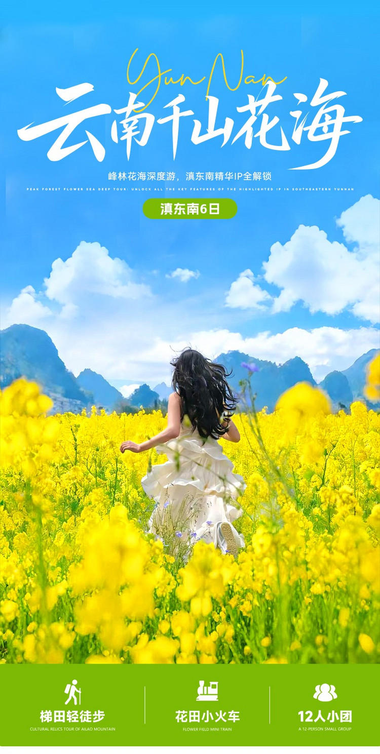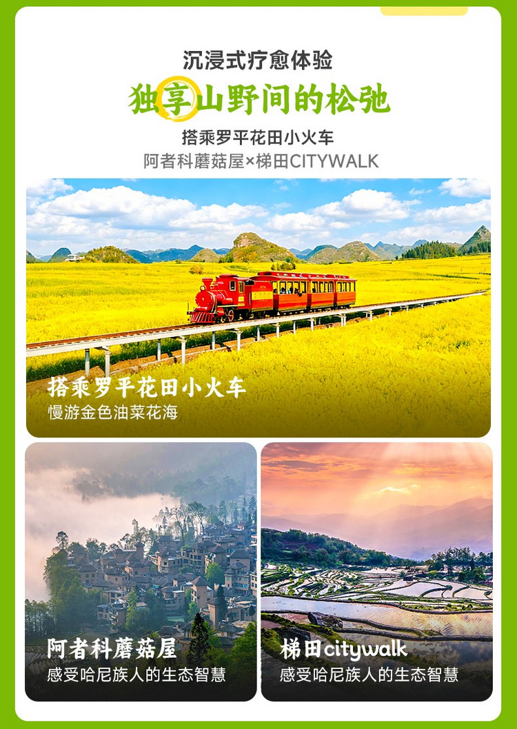 13:00 前往【罗平油菜花主会场】。罗平有两项“油菜花之最”,一是有国内最早的油菜花季,一般从每年二月初开始,持续到三月底四月初,是年初赏花的著名油菜花旅游目的地。二是罗平是吉尼斯世界纪录认证的“世界最大的自然天成花园”,这个花园最多的花自然是油菜花,光是连成片的油菜花就达二十万亩,被称为油菜花海也不为过。我们在这里为大家赠送【花田小火车】体验,在油菜花海留下一次难忘的回忆。