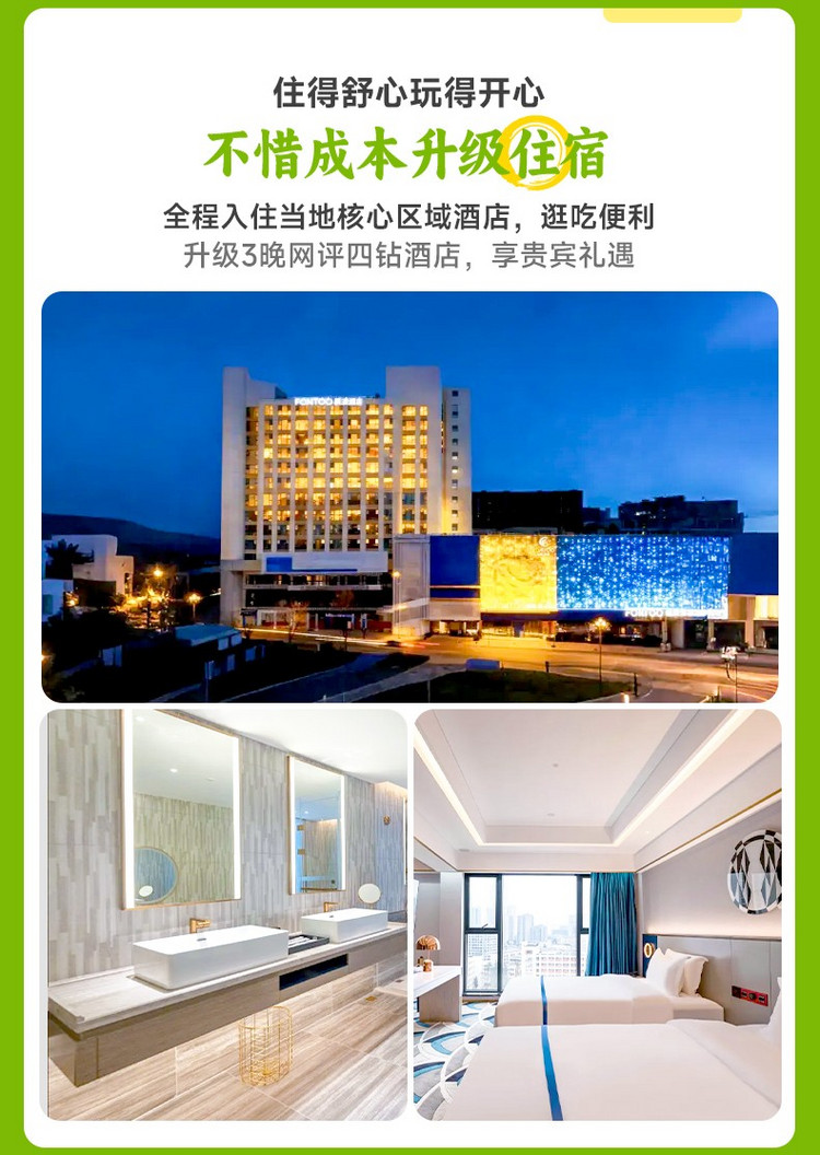 行程中的所列的酒店类型,2星/2钻=经济型;3星/3钻=舒适型;4星/4钻=高档型;5星/5钻=豪华型;意为评定或条件到达相应标准的酒店,少部分地区,由于政策等因素,可能存在酒店条件满足,但未进行星钻评定的情况。