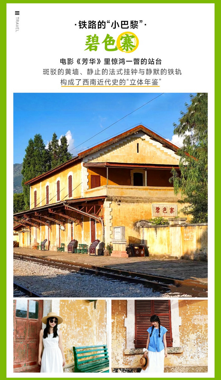 14:30到达【碧色寨·滇越铁路】,法式站房鹅黄墙面剥落如癣,【三面钟】锈针卡在1910。踩上米轨的瞬间,红土从枕木裂缝涌出,中国第一块【红土网球场】浮现而来。候车廊孔雀蓝木窗忽被撞开——百年未发的列车,正载着野象群冲进站长室的镜中。【芳华】拍摄的痕迹仍在其中,【滇越铁路】货运列车仍穿梭在【北回归线纪念碑】旁。