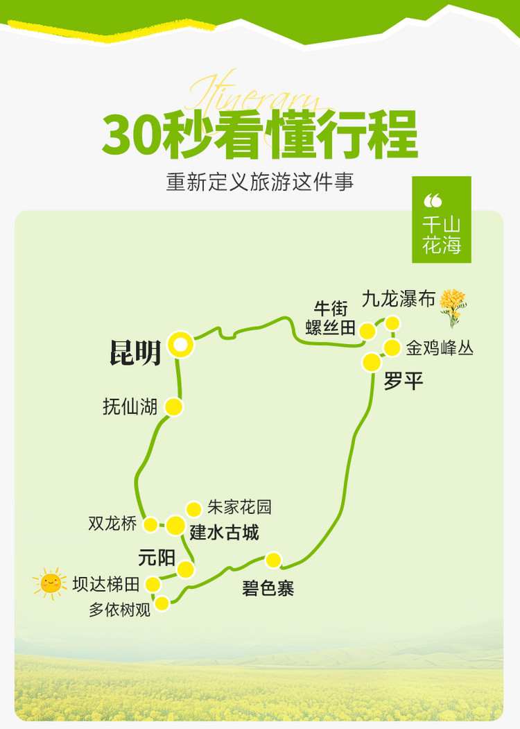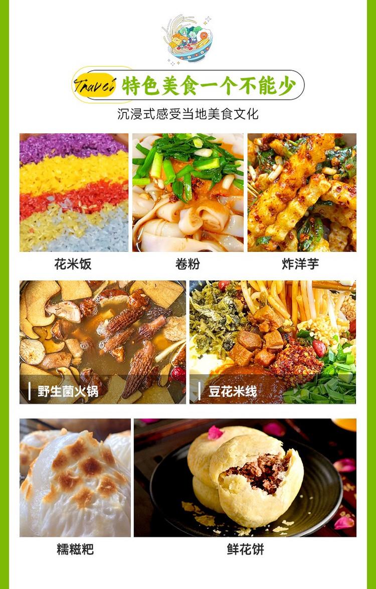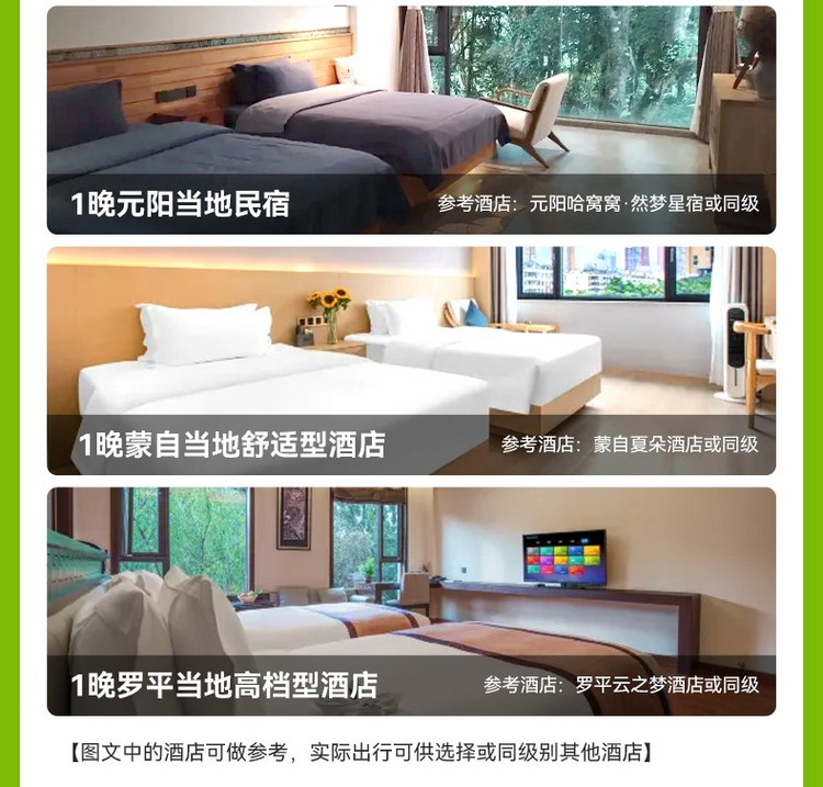 4、门票:圆通山,九龙瀑布,金鸡峰,团山民居,朱家花园,元阳景区,阿者科,加级寨,禄充,碧色寨电瓶车