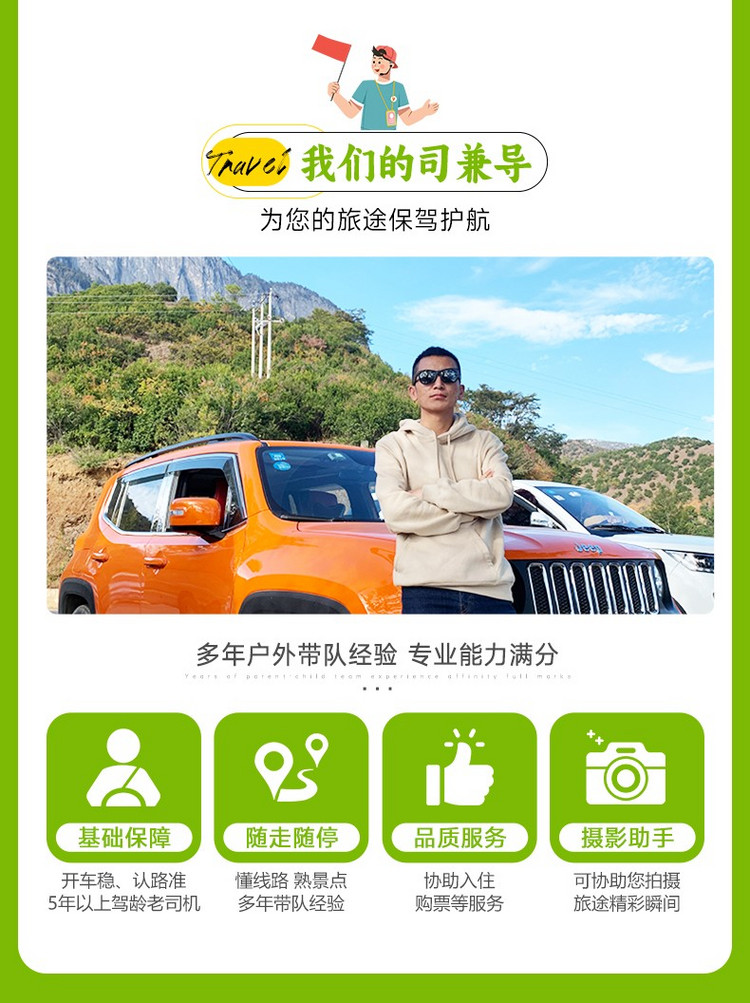5、领队:司机兼领队(司机仅提供向导、代办住宿等服务;无法像专业领队一样提供讲解、景区伴游等服务!)