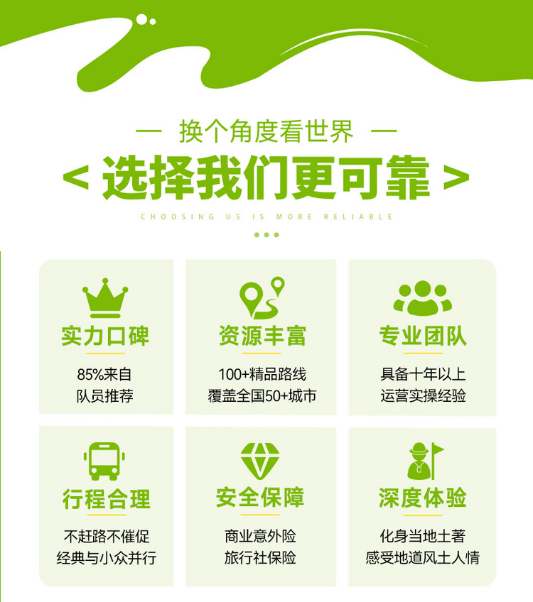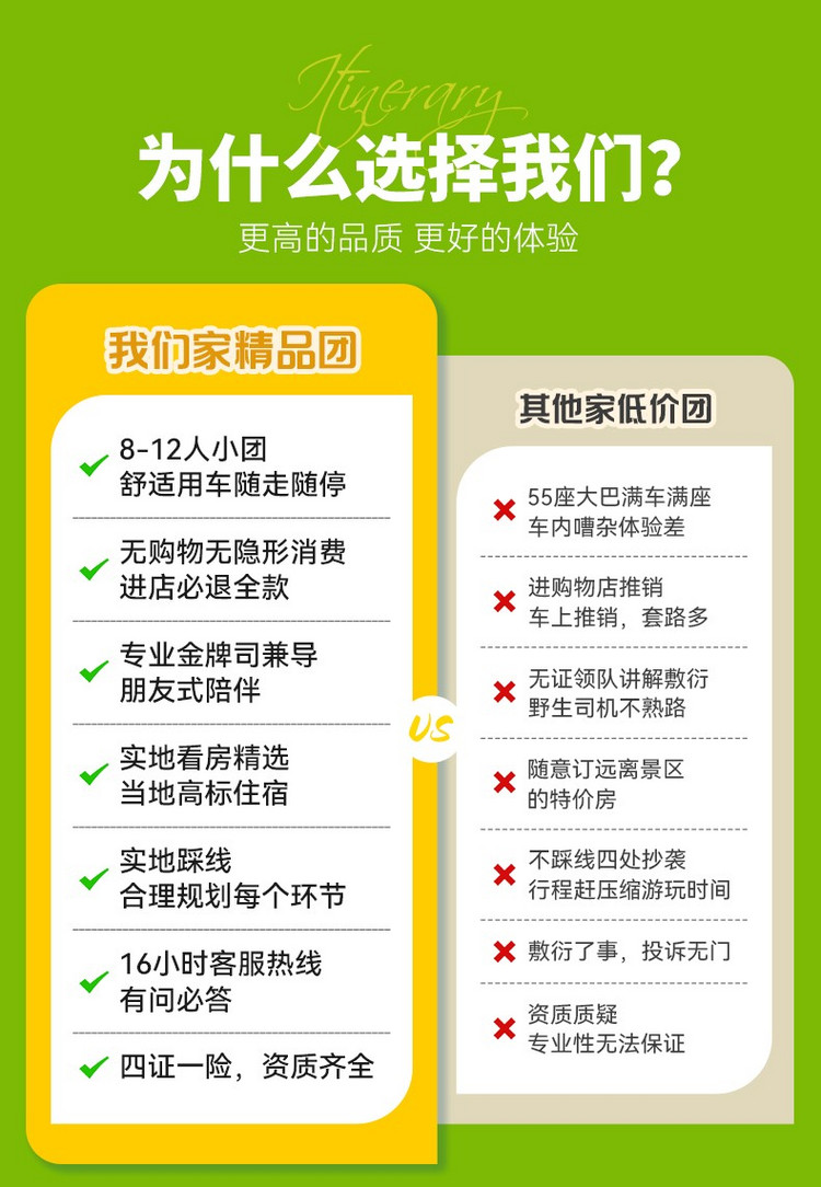 13、行程中司机、领队等工作人员拍摄的照片或者视频有可能会用于我司宣传线路之用,无其他用途;如您介意可联系我司第一时间删除,保证您的权益。