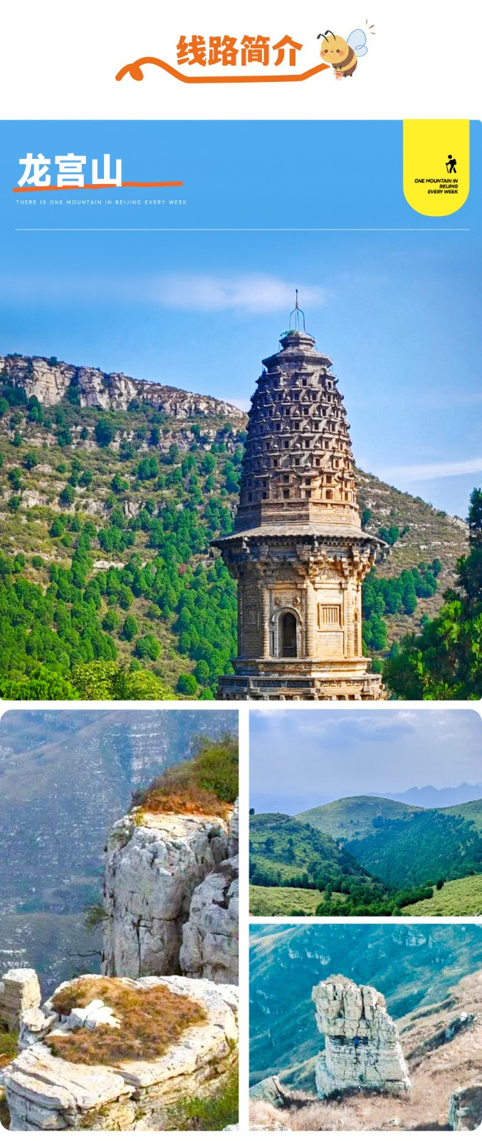 龙宫山位于河北省涞水县洛平村北2.5公里处,属于太行山北部余脉,以独特的白色怪石林、千年古塔“庆化寺花塔”以及传说中作为中华音乐发祥地的文化底蕴而闻名。龙宫山不仅是中华音乐的发源地,还拥有始建于汉代的庆化寺和宋辽金时期的千年花塔。这里的景色被誉为“朝阳拜佛,夕日沫金”,是涞水八大景观之一。近年来,因国产游戏《黑神话:悟空》在此取景,吸引了更多户外爱好者前往。这里可以看到怪石林立,宝塔古寺,原始山林,山地灌木,每一处都是大自然的杰作。我们沿着村路和山脊路前行,穿越怪石林,游玩打卡拍照。