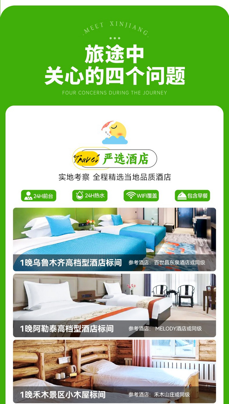 3、 行程中的所列的酒店类型,2星/2钻=经济型;3星/3钻=舒适型;4星/4钻=高档型;5星/5钻=豪华型;意为评定或条件到达相应标准的酒店,少部分地区,由于政策等因素,可能存在酒店条件满足,但未进行星钻评定的情况;