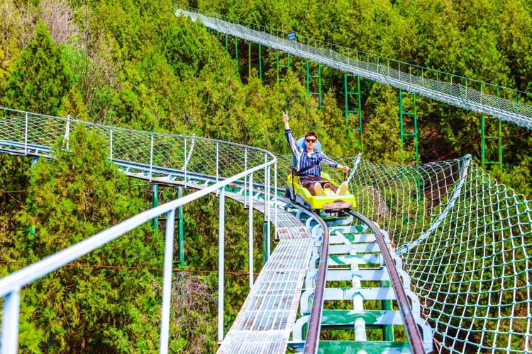 排排坐在滑道上,感受穿梭林间的快乐