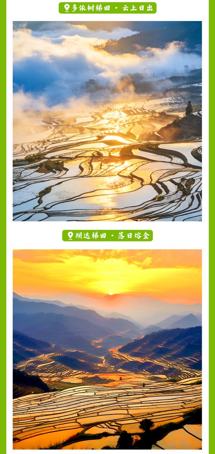 15:30抵达元阳后沿途欣赏【箐口民俗村】,【老虎嘴梯田】。随后前往等候【坝达日落】,前往等候【坝达日落】,夕阳西下满天红霞的时候,站在坝达,千年梯田就在脚下向远处延伸,镜面般的田面反射着霞光,笼上暖暖的金色,衬托出柔美的曲线,不得不感叹人与自然的鬼斧神工。