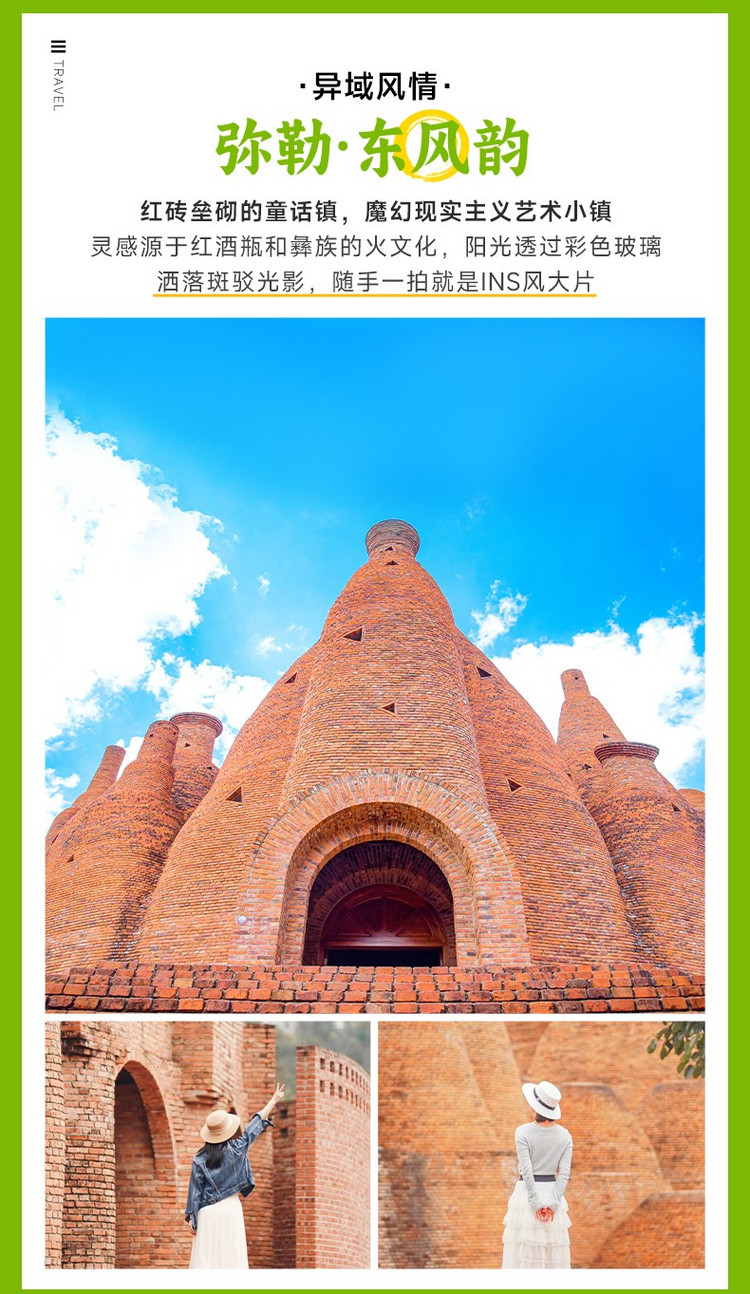 09:00 前往网红打卡地【东风韵小镇】,这是一个集休闲度假、佛教文化、民俗体验、生态观光于一体的艺术小镇。景区内建筑是以本地生产的红砖为主,将三种当地文化混合其中,十分具有设计感,其中酒瓶状建筑代表的是弥勒的红酒文化,还有彝族的火文化和共生向上的文化。