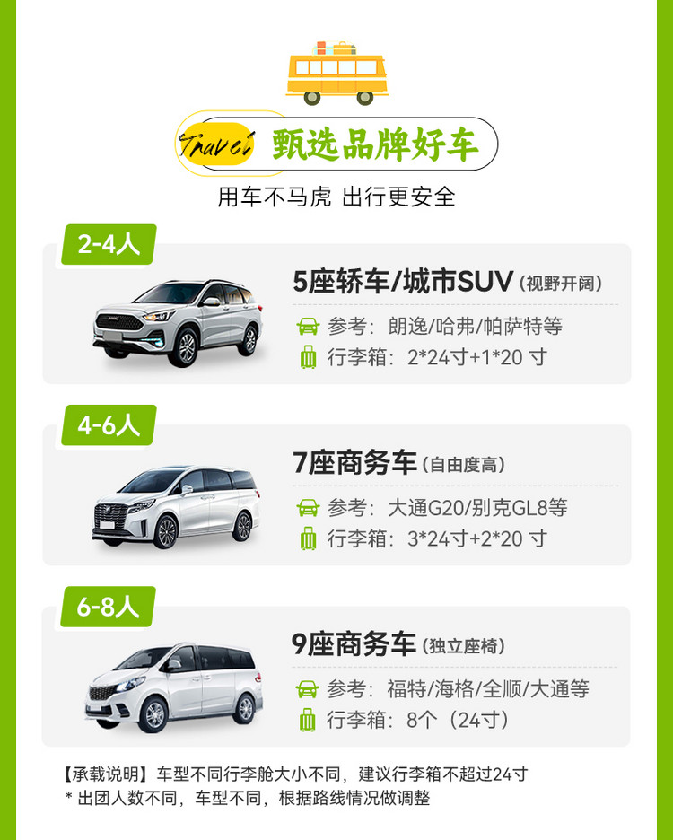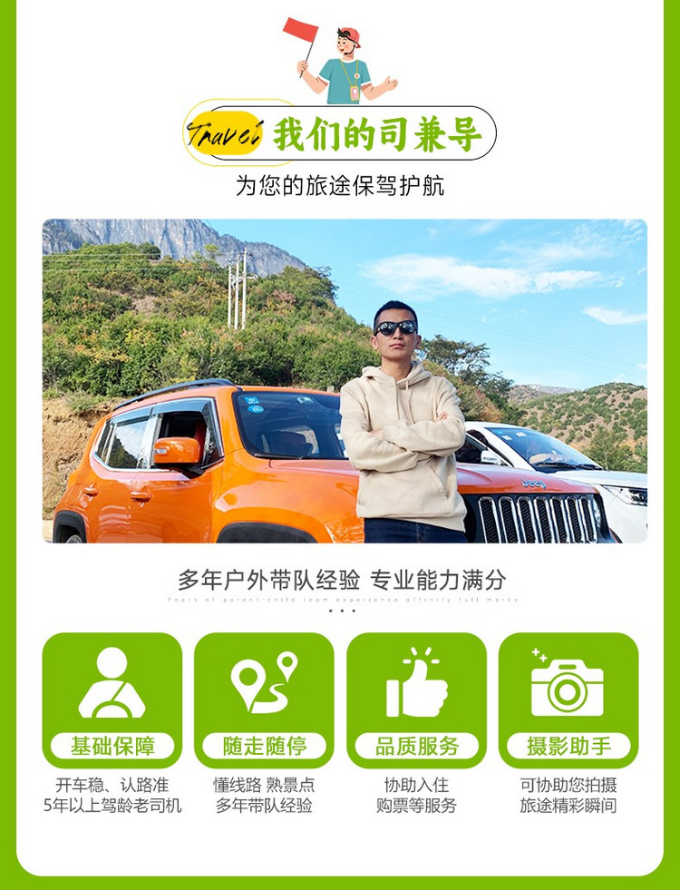 5、领队:司机兼领队(司机仅提供向导、代办住宿等服务;无法像专业领队一样提供讲解、景区伴游等服务!)