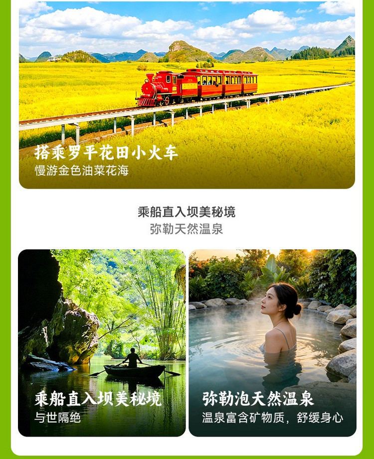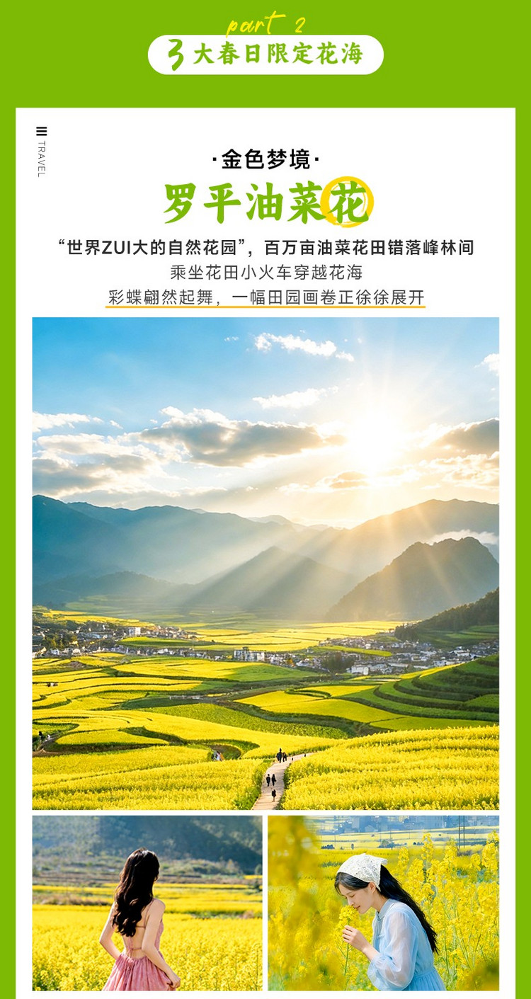 13:00 抵达【罗平油菜花主会场】。罗平有两项“油菜花之最”,一是有国内最早的油菜花季,一般从每年二月初开始,持续到三月底四月初,是年初赏花的著名油菜花旅游目的地。二是罗平是吉尼斯世界纪录认证的“世界最大的自然天成花园”,这个花园最多的花自然是油菜花,光是连成片的油菜花就达二十万亩,被称为油菜花海也不为过。我们在这里为大家赠送【花田小火车】体验,在油菜花海留下一次难忘的回忆。