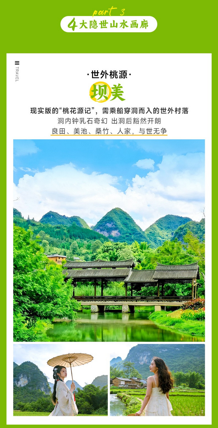 13:00 前往【坝美·世外桃源】抵达此地需完成一场仪式:乘船穿过幽暗溶洞,仿佛穿越时光隧道。洞尽天明,古榕、水车与稻田忽然浮现,壮族村落静卧群山怀中。这里是现代版桃花源记的真实注脚,守护着与世无争的农耕光阴。。