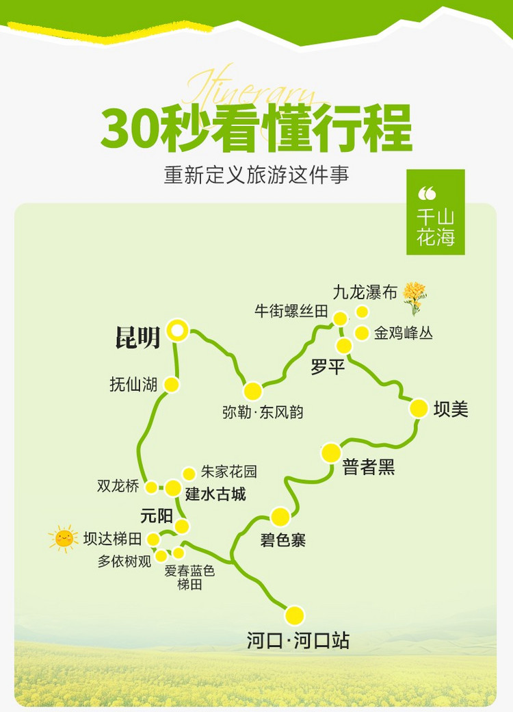 4、门票:圆通山,碌充,朱家花园、元阳、阿者科、加级寨、碧色寨、三生三世、坝美、罗平小火车、金鸡峰、九龙瀑布、东风韵