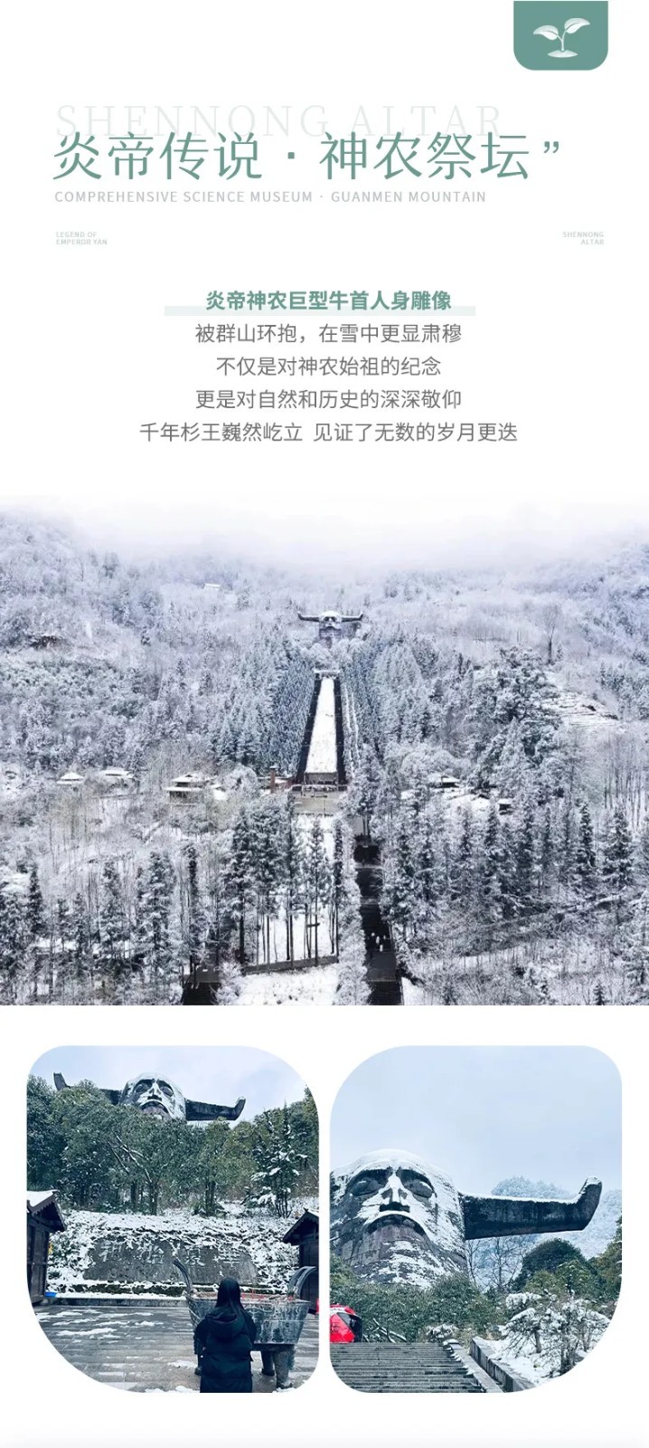 到达神农架后前往【神农坛】它是为纪念炎黄子孙共同的祖先炎帝神农氏而建造的祭坛,沿着珍稀植物园中的石板路蜿蜒上行,就能看到传说中的【千年杉王】,祭坛按照天子祭坛的规格修建,分为天坛和地坛。天坛上伫立着巨型神农牛首人身雕像。