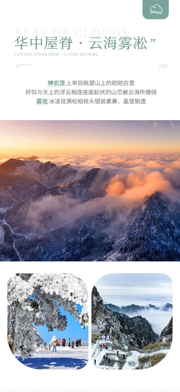 下午前往【神农顶景区】在车行至神农顶,举目眺望,山上的皑皑白雪,好似与天上的浮云相连,座座起伏的山峦被云海所缠绕,山峰若隐若现、如梦似幻,蔚为壮观。漫天的云海在阳光的照射下随风飘移,时而上升,时而下坠,时而回旋,时而舒展,构成一幅奇特的云海奇观。近处,四季常青的松柏上雾凇冰凌挂满枝头,路边雪松、雾凇、冰凌,银装素裹、晶莹剔透。