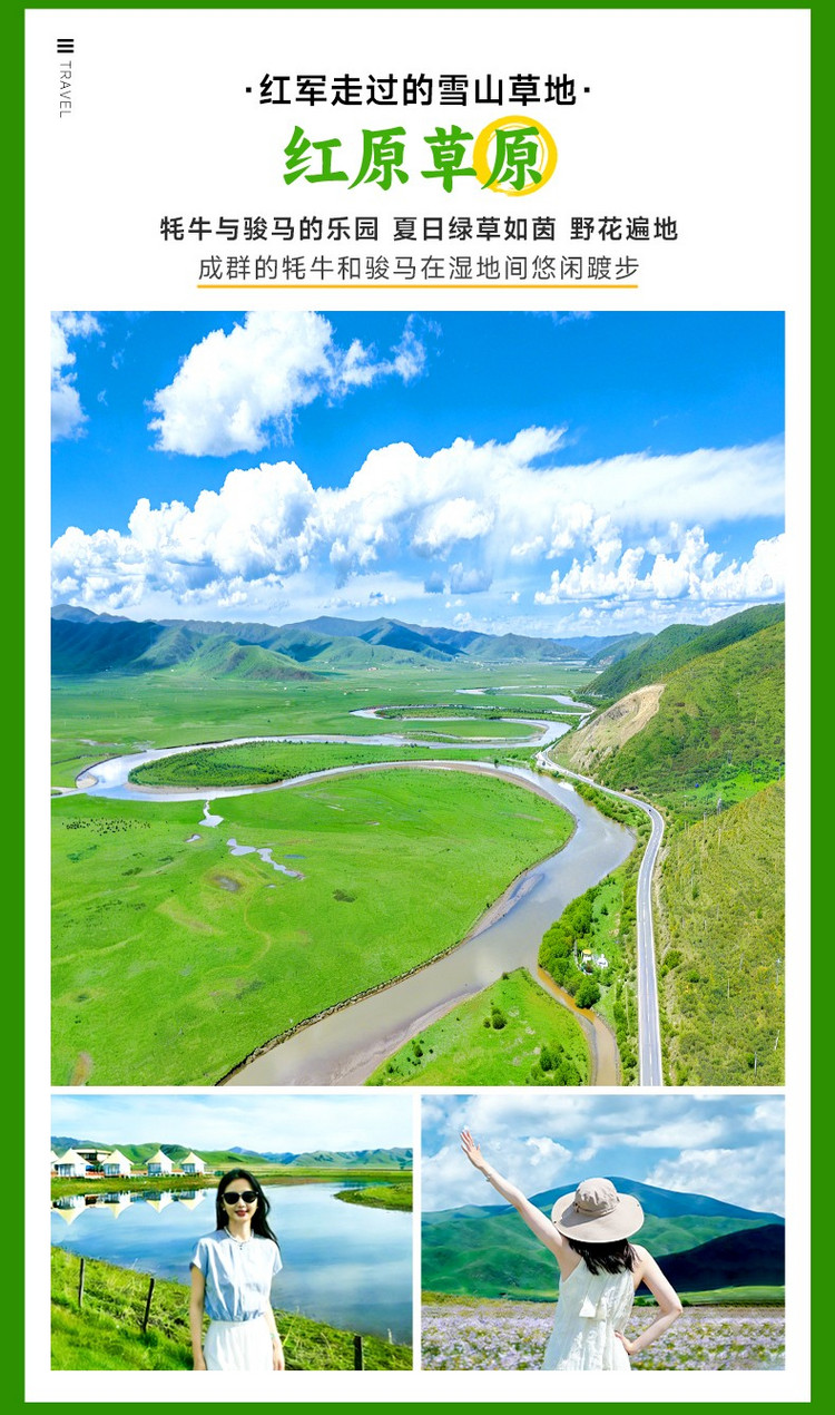 早餐后,乘车出发前往【红原草原】,这里是长征红军曾穿越过的草原,既有历史的厚重,也有自然的壮阔。夏季绿草如茵,野花遍地,河流蜿蜒,牧民毡房升起的袅袅炊烟,天地之辽阔在此呈现。