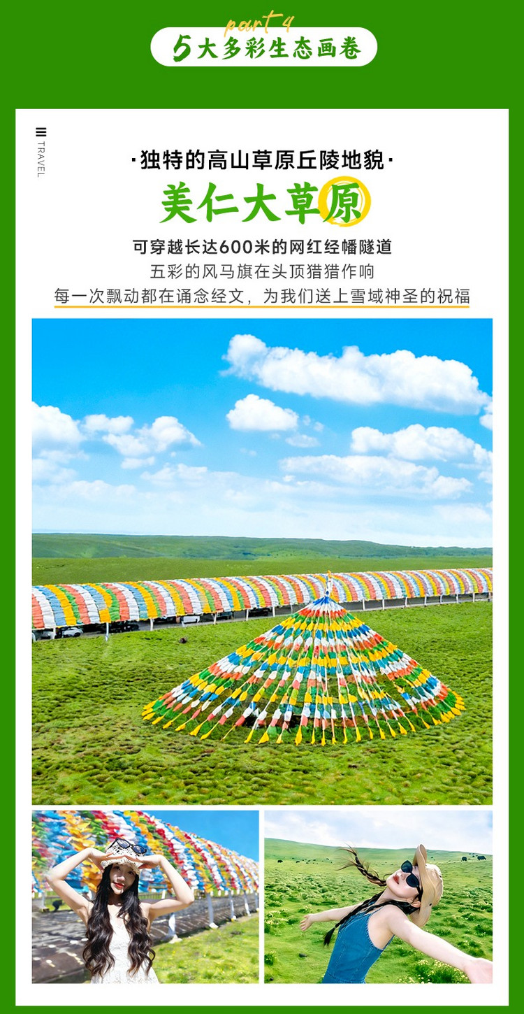 早餐后前往【美仁大草原】(车程约220km,用时约4小时,游玩约2小时),一路风景如画,牛羊成群悠闲自得,座座帐篷如明珠般镶嵌在碧绿的草地上,呈现在你眼前的每一幅景观几乎都似是Windows的桌面一般,令人心情无比舒畅。这里的草原和别处不一样,它的表面是一个个隆起的小草包,这正是它独有的冻胀丘地貌。这里也拥有长达长达600米的网红经幡隧道,拍照非常出片。